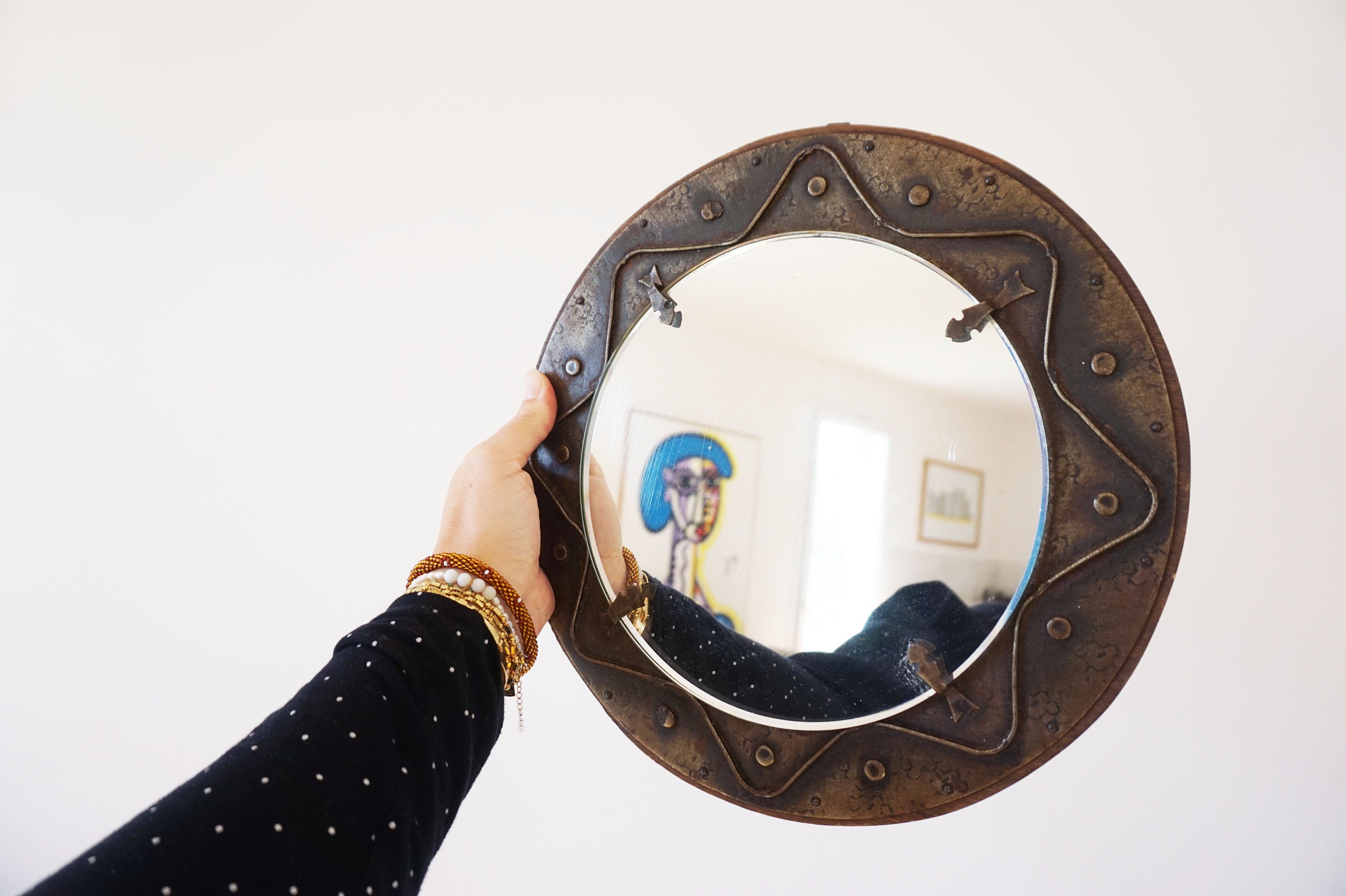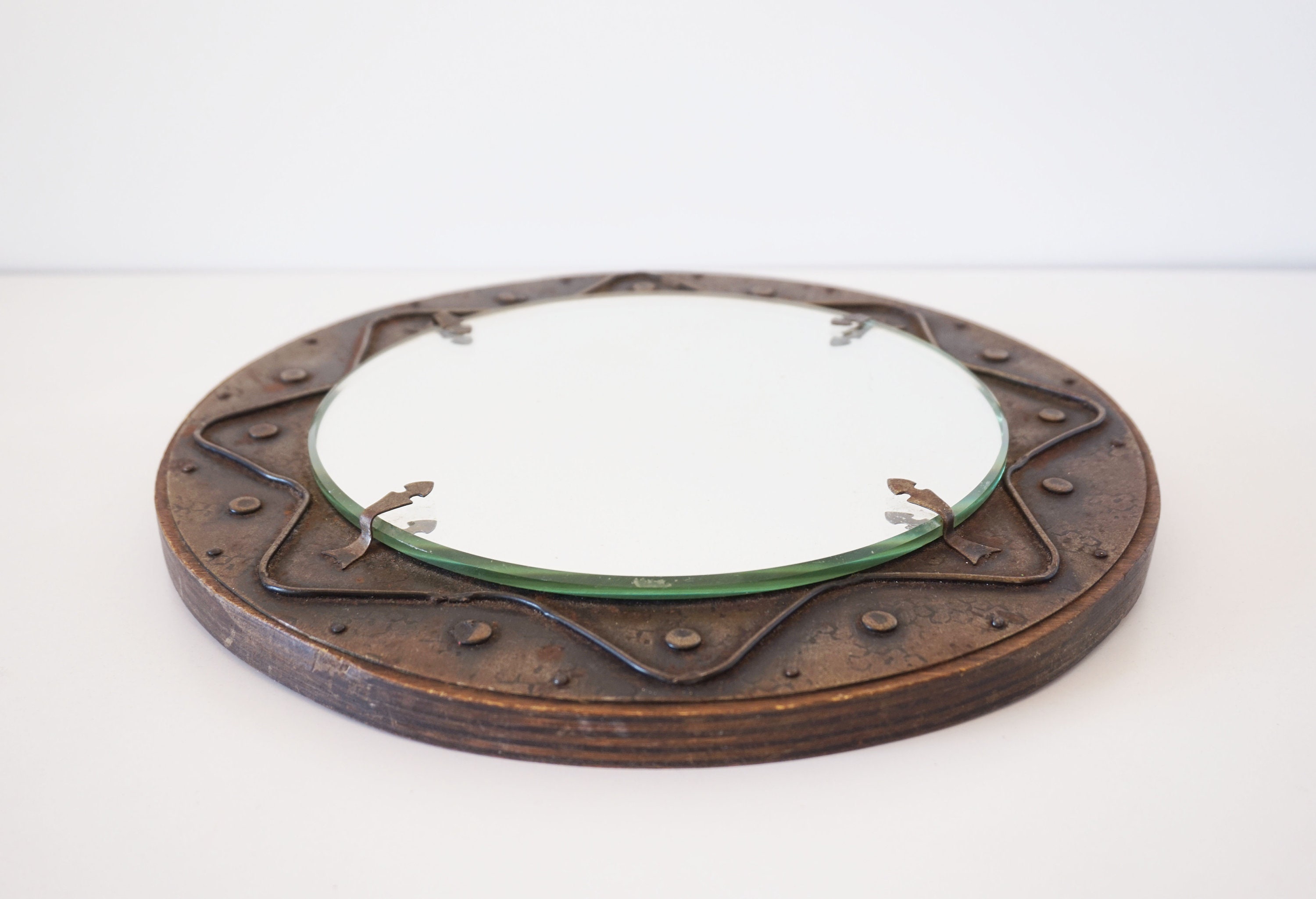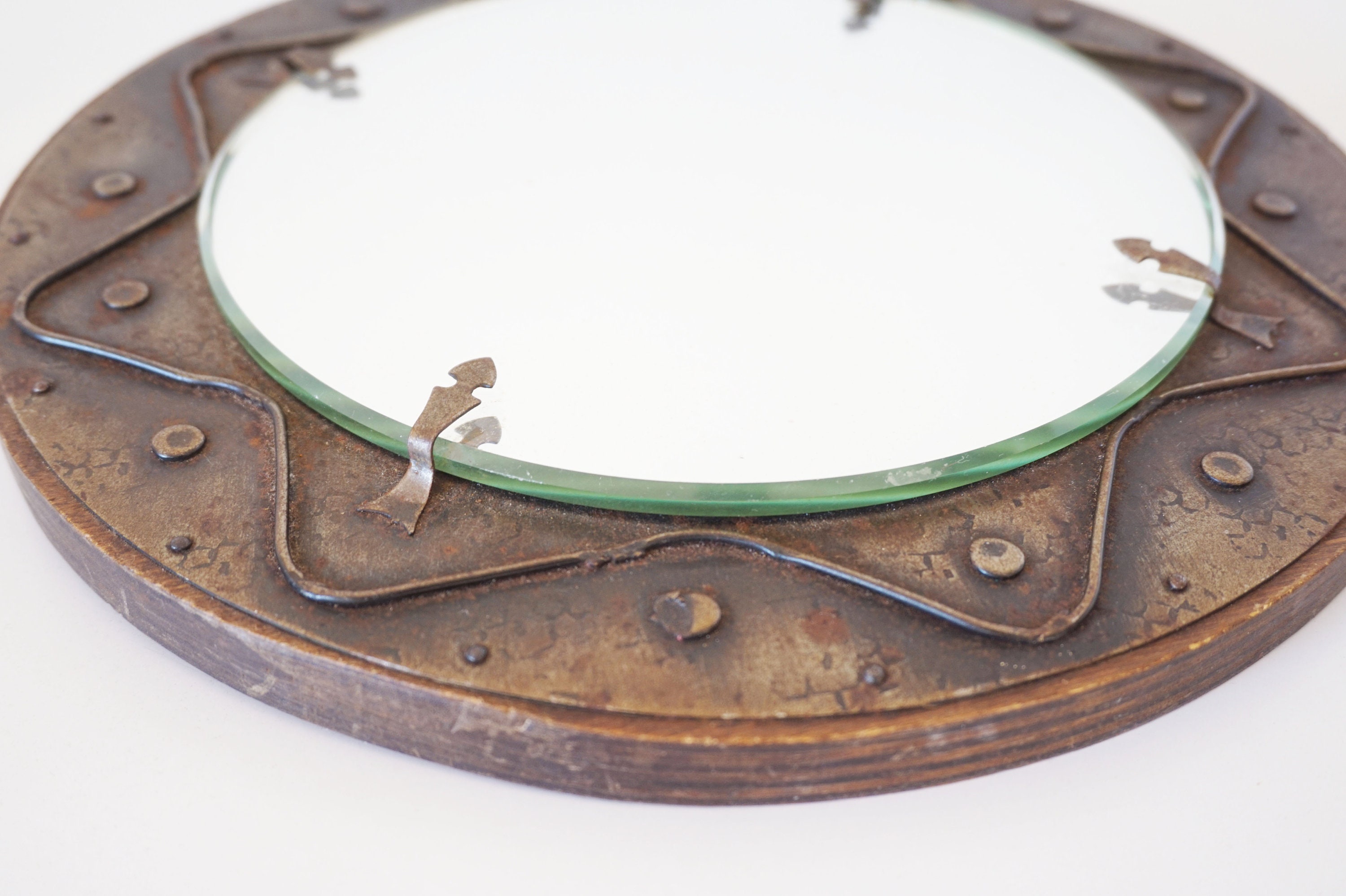 Mirror held in place with patinated metal fixing brackets.