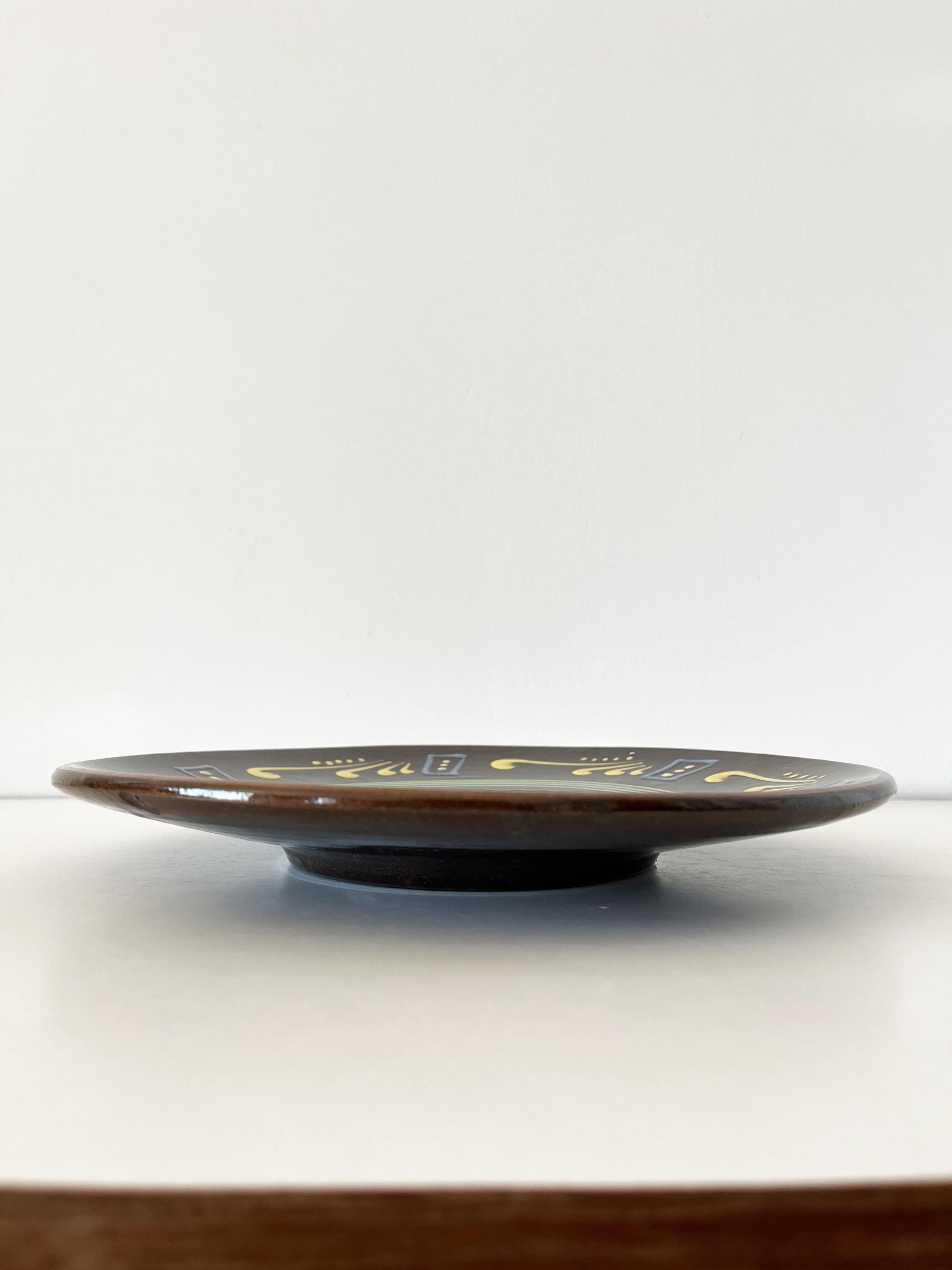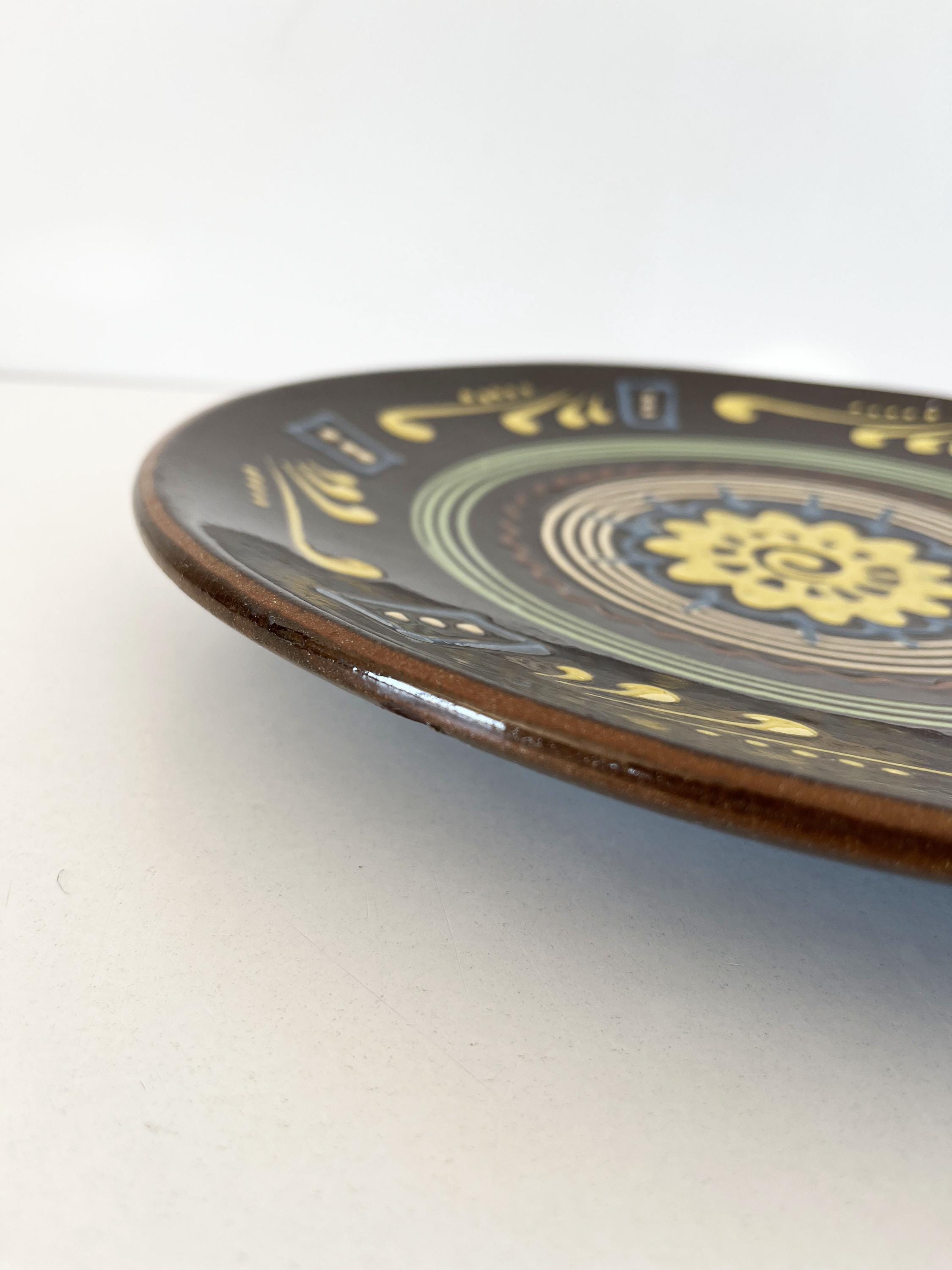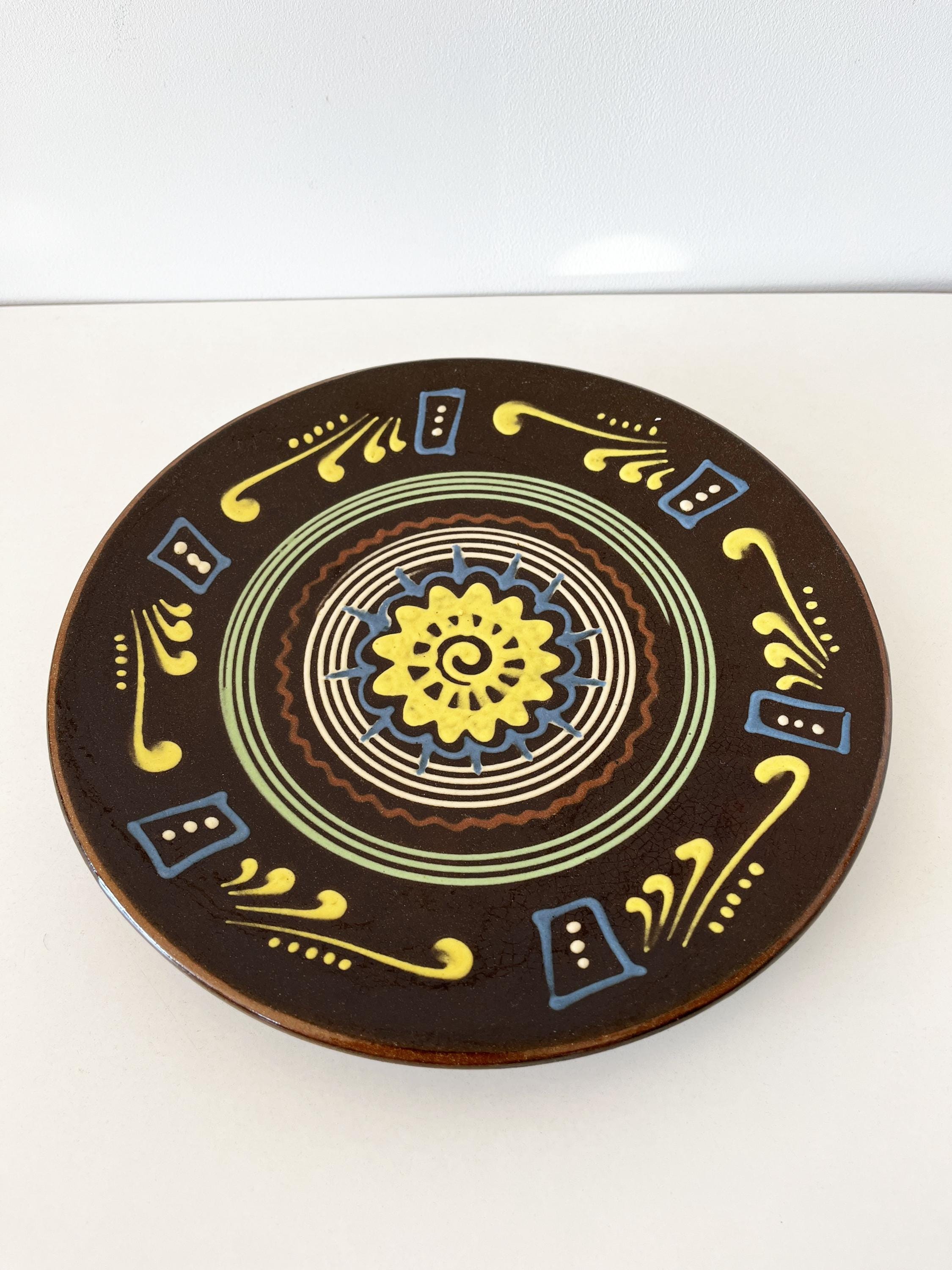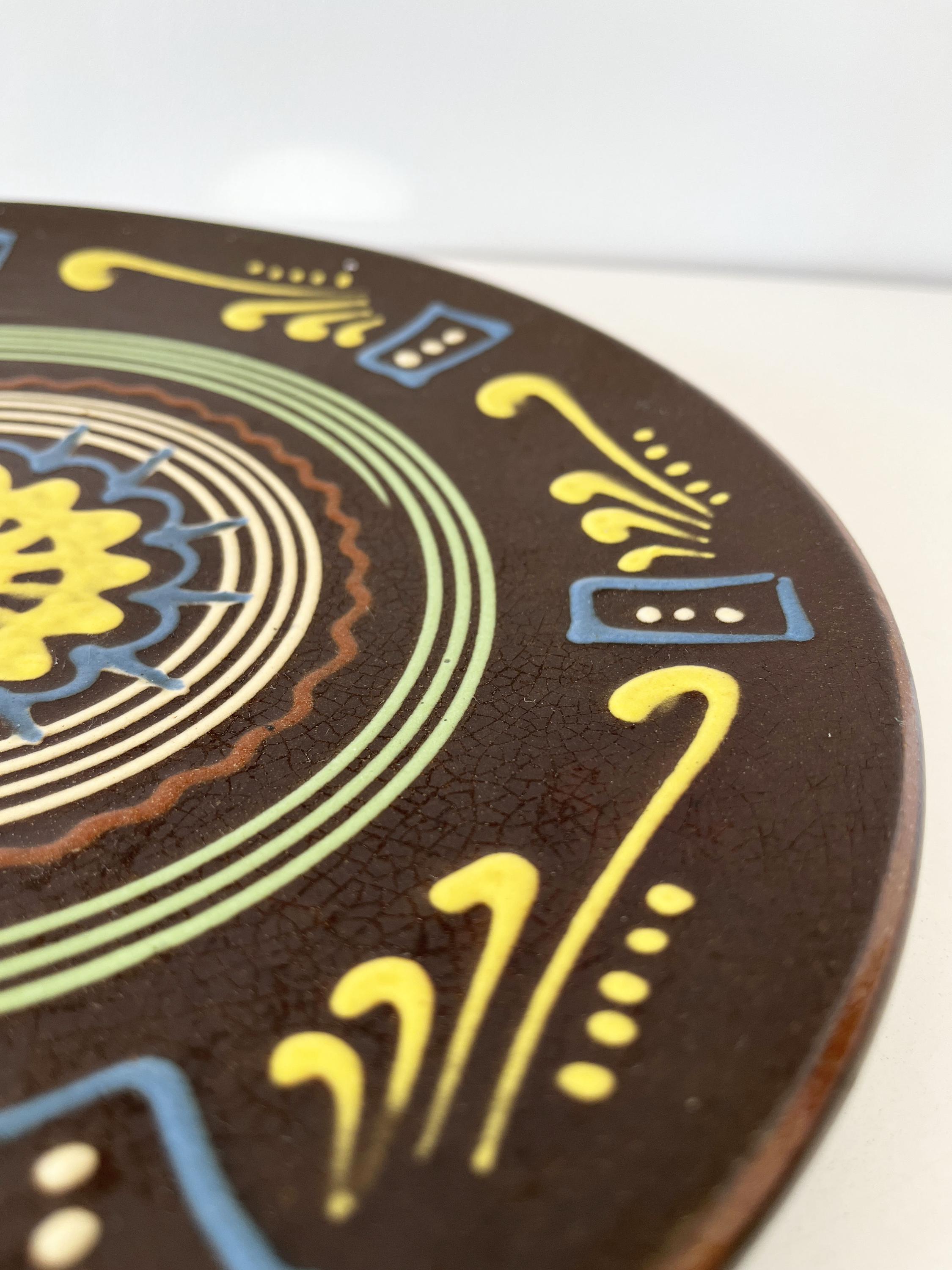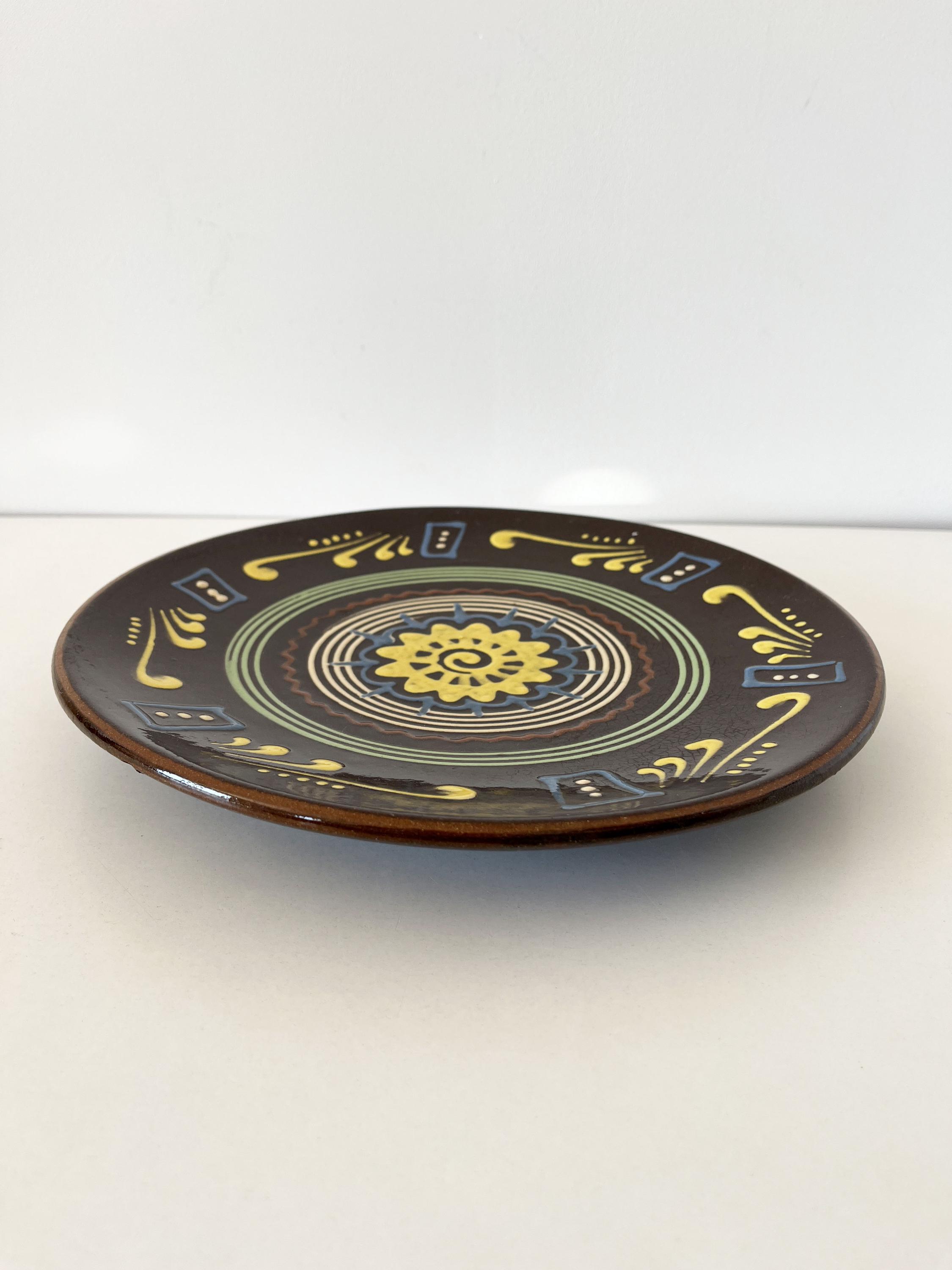 Glossy enamel, in brown, yellow and blue, with a floral pattern.