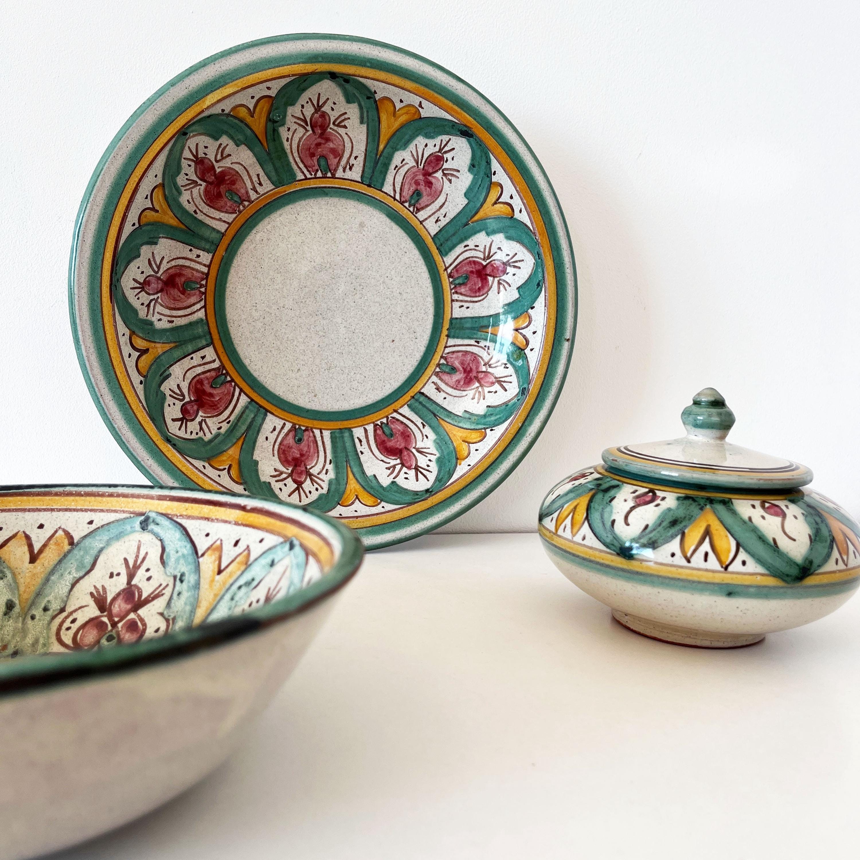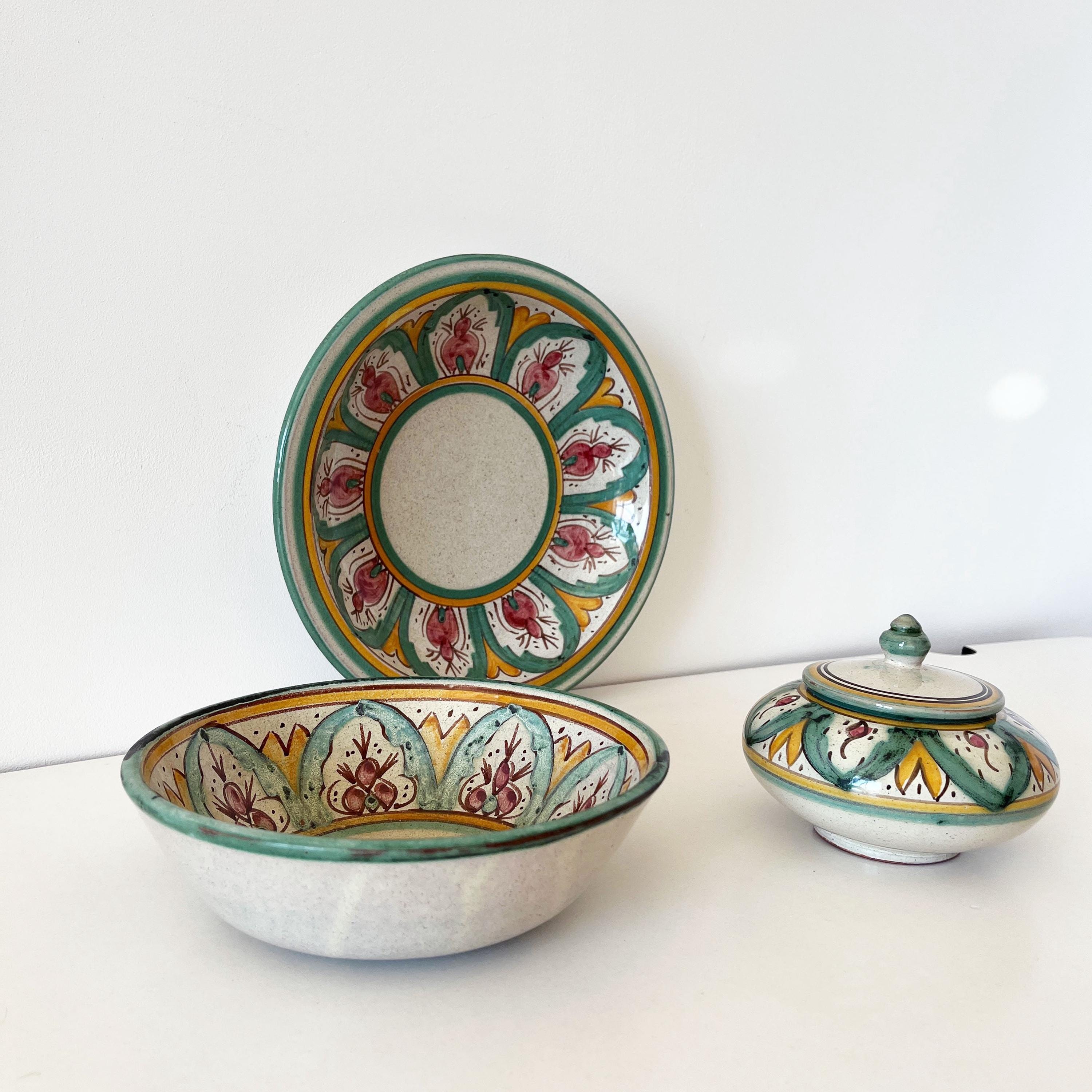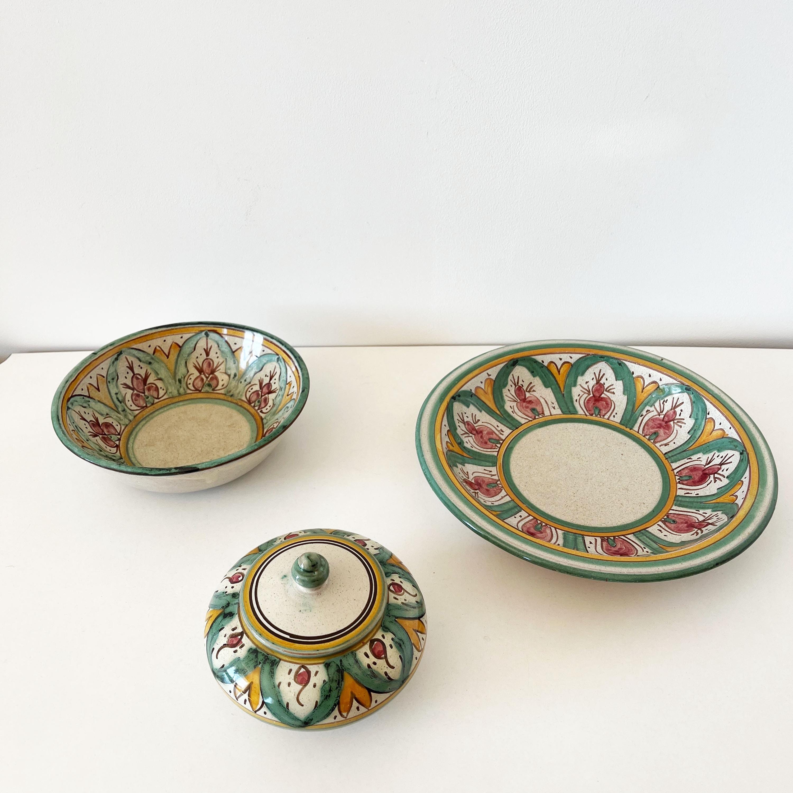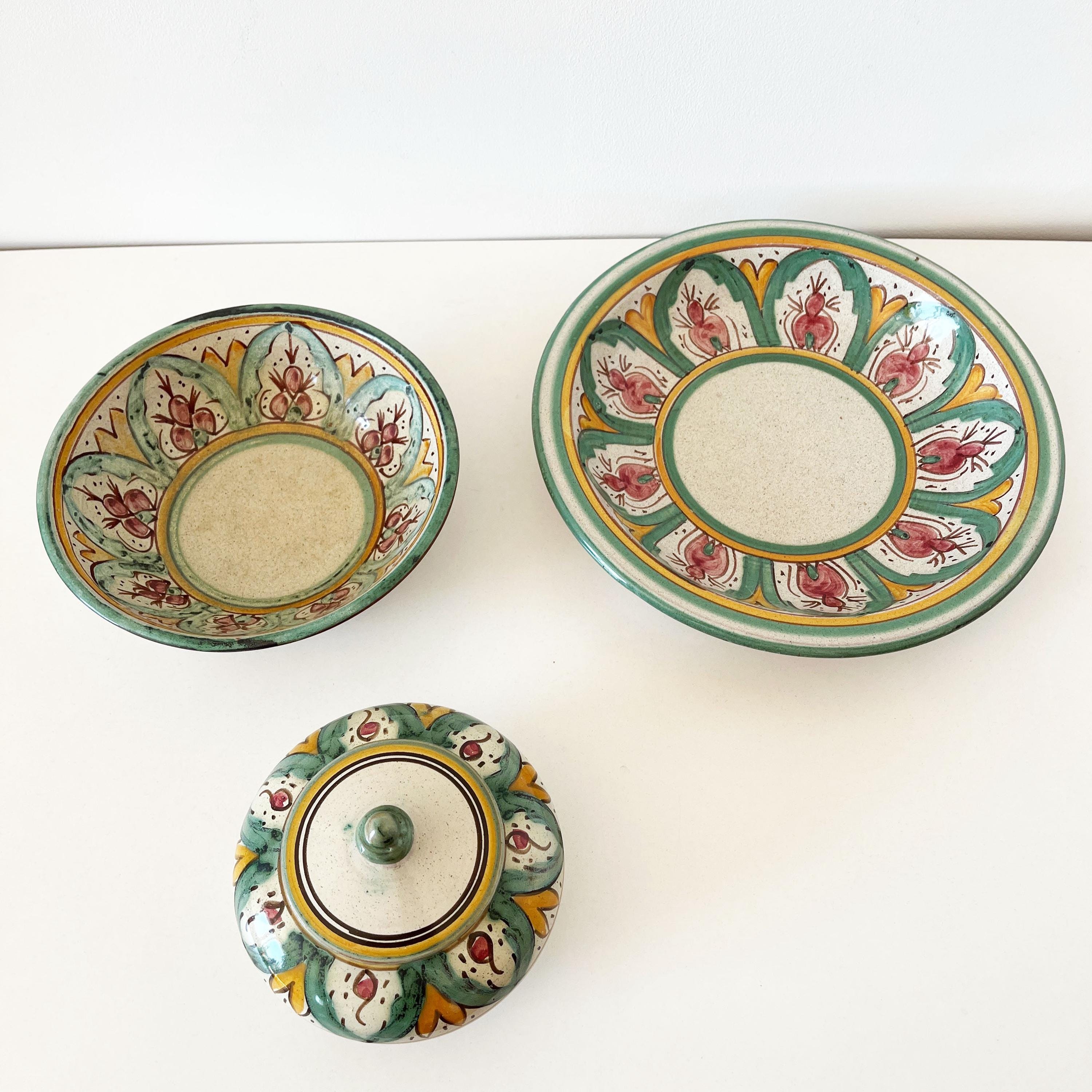 Set of 3 vintage hand-painted ceramic dishes in shades of green, pink, and yellow.
