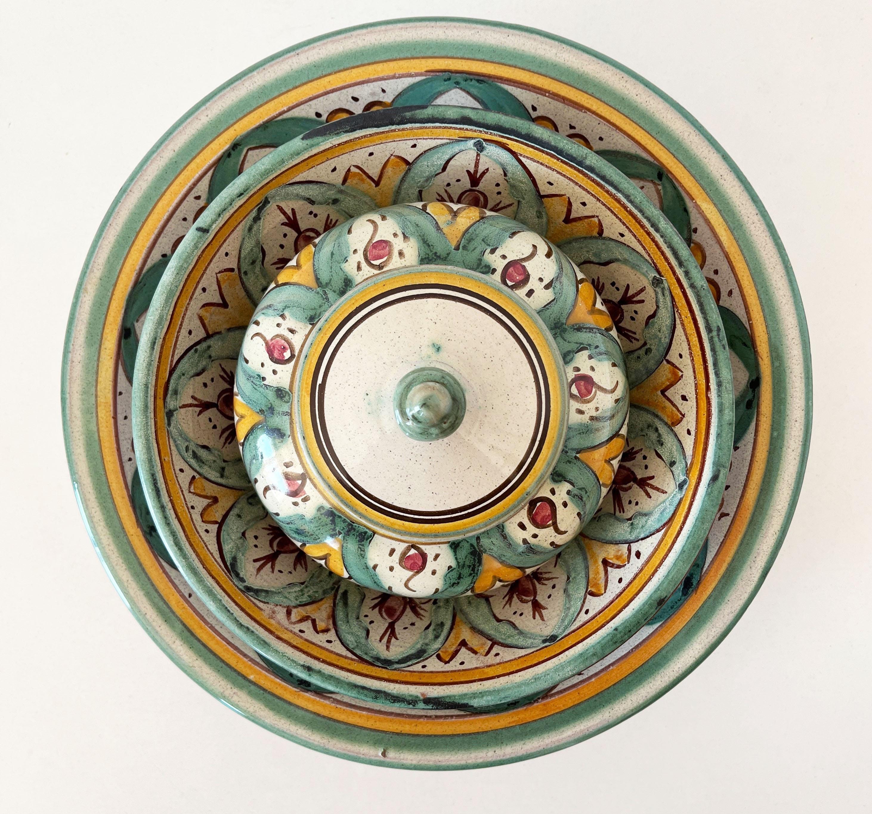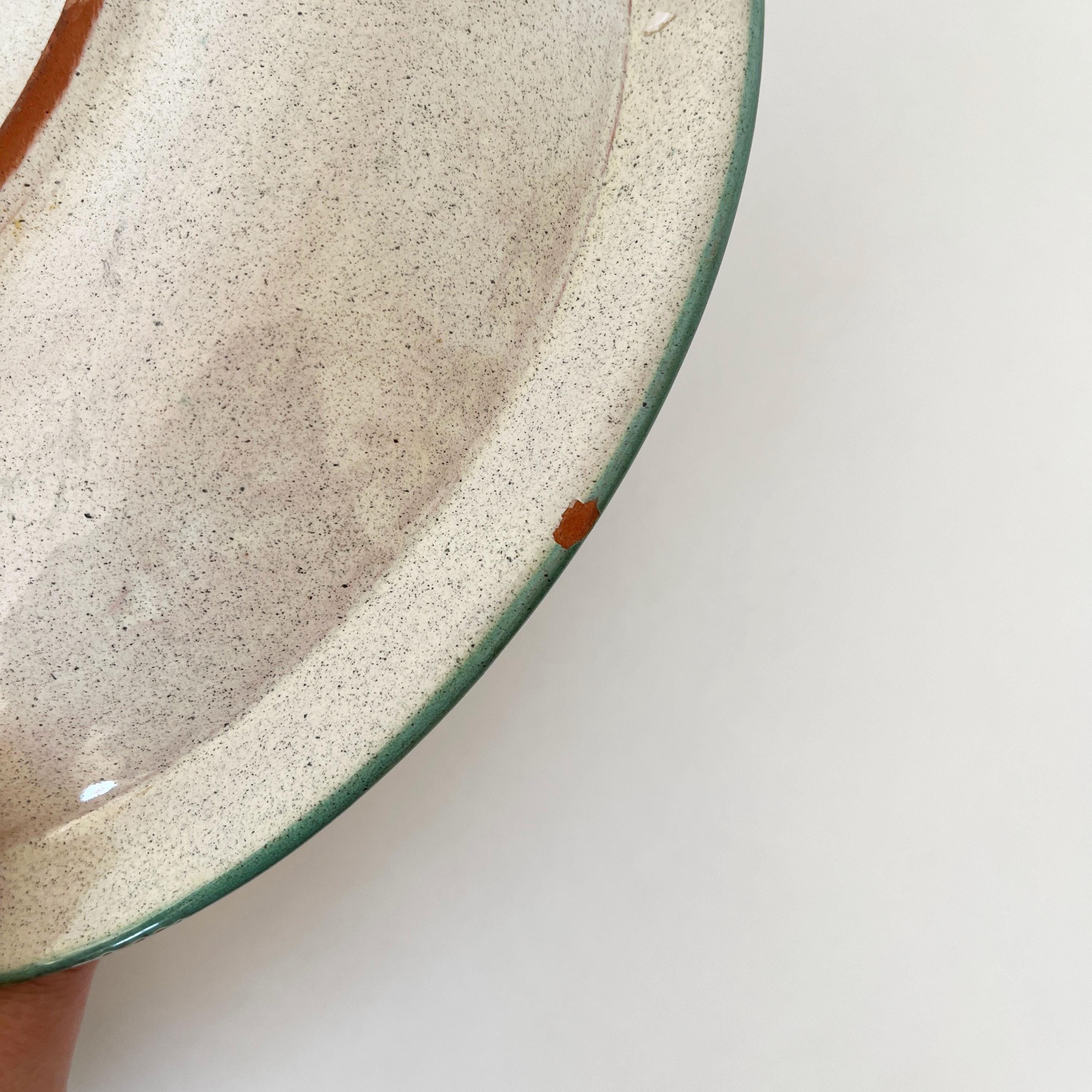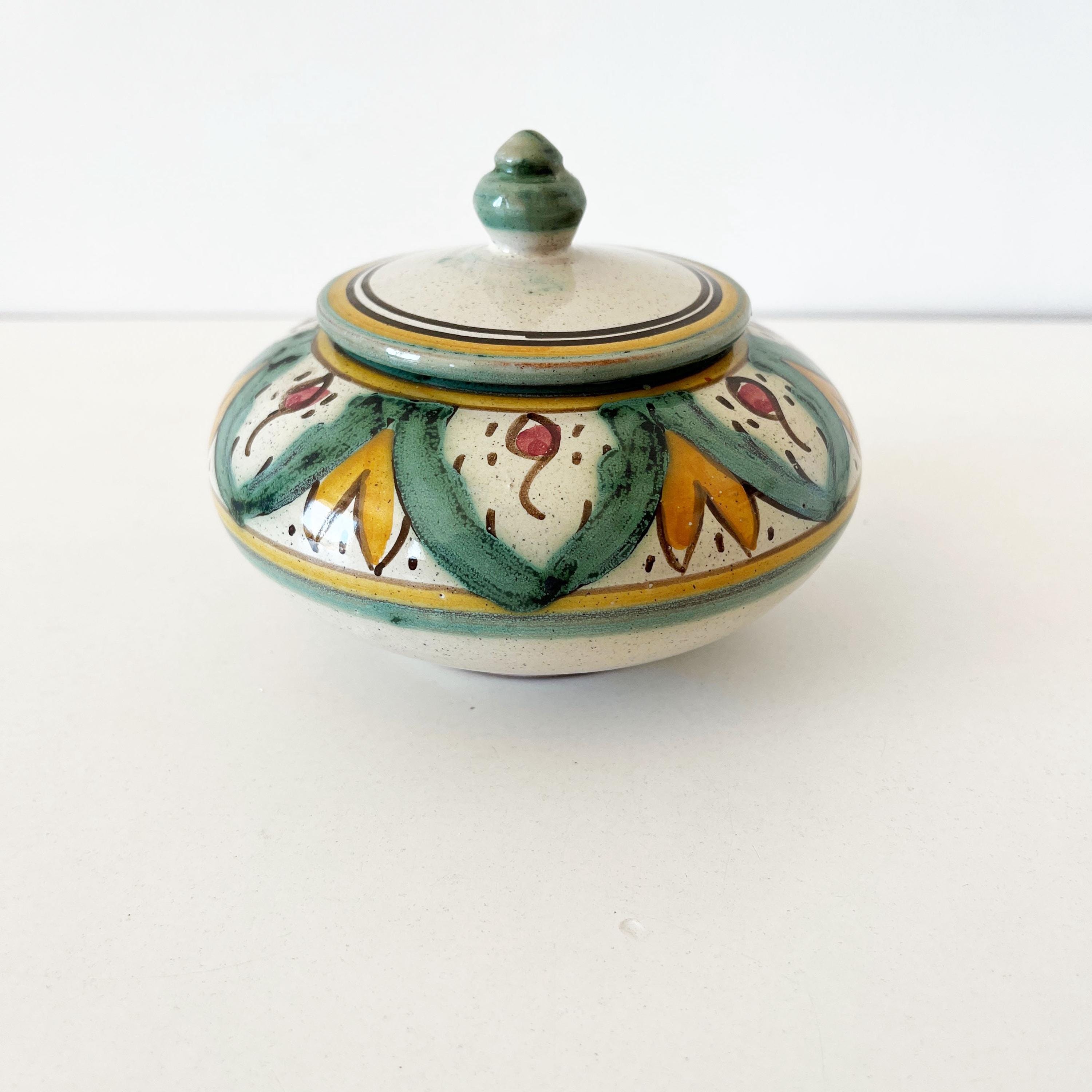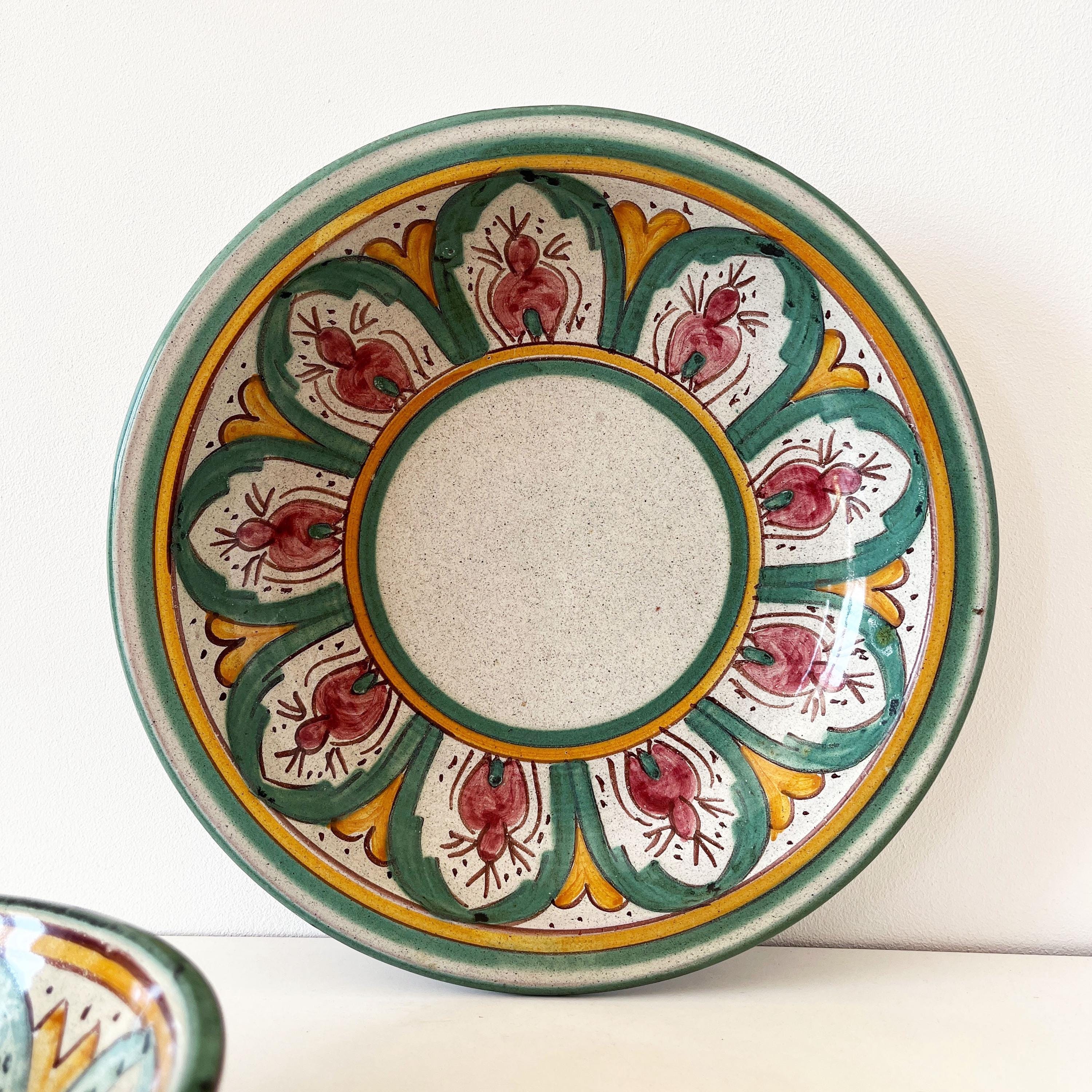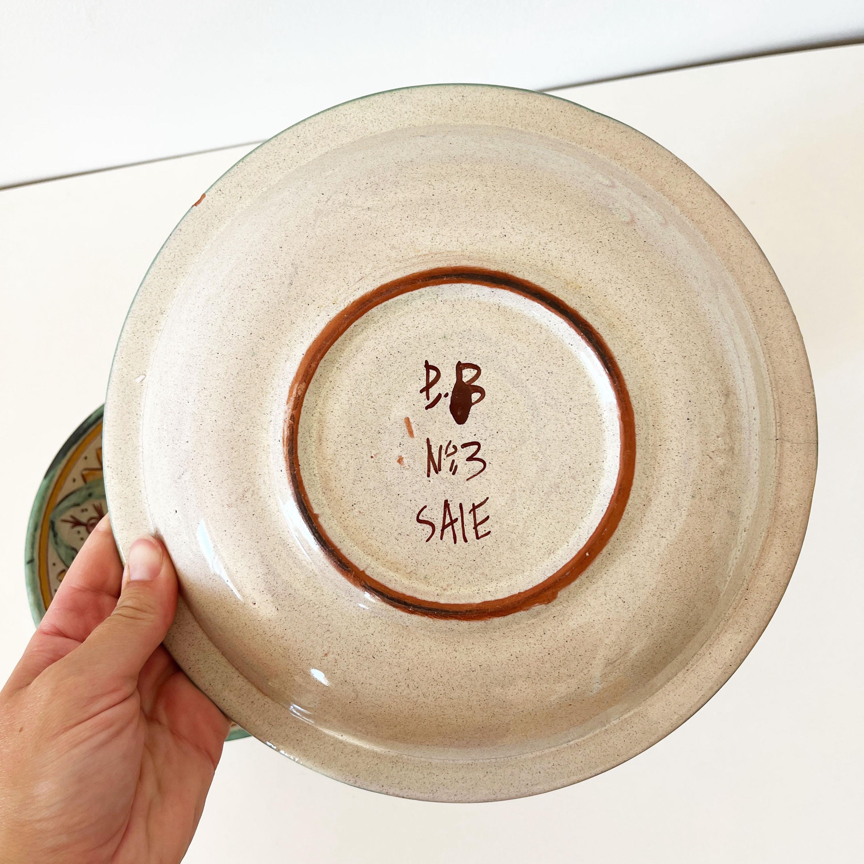 Set of 3 vintage hand-painted ceramic dishes in shades of green, pink, and yellow.