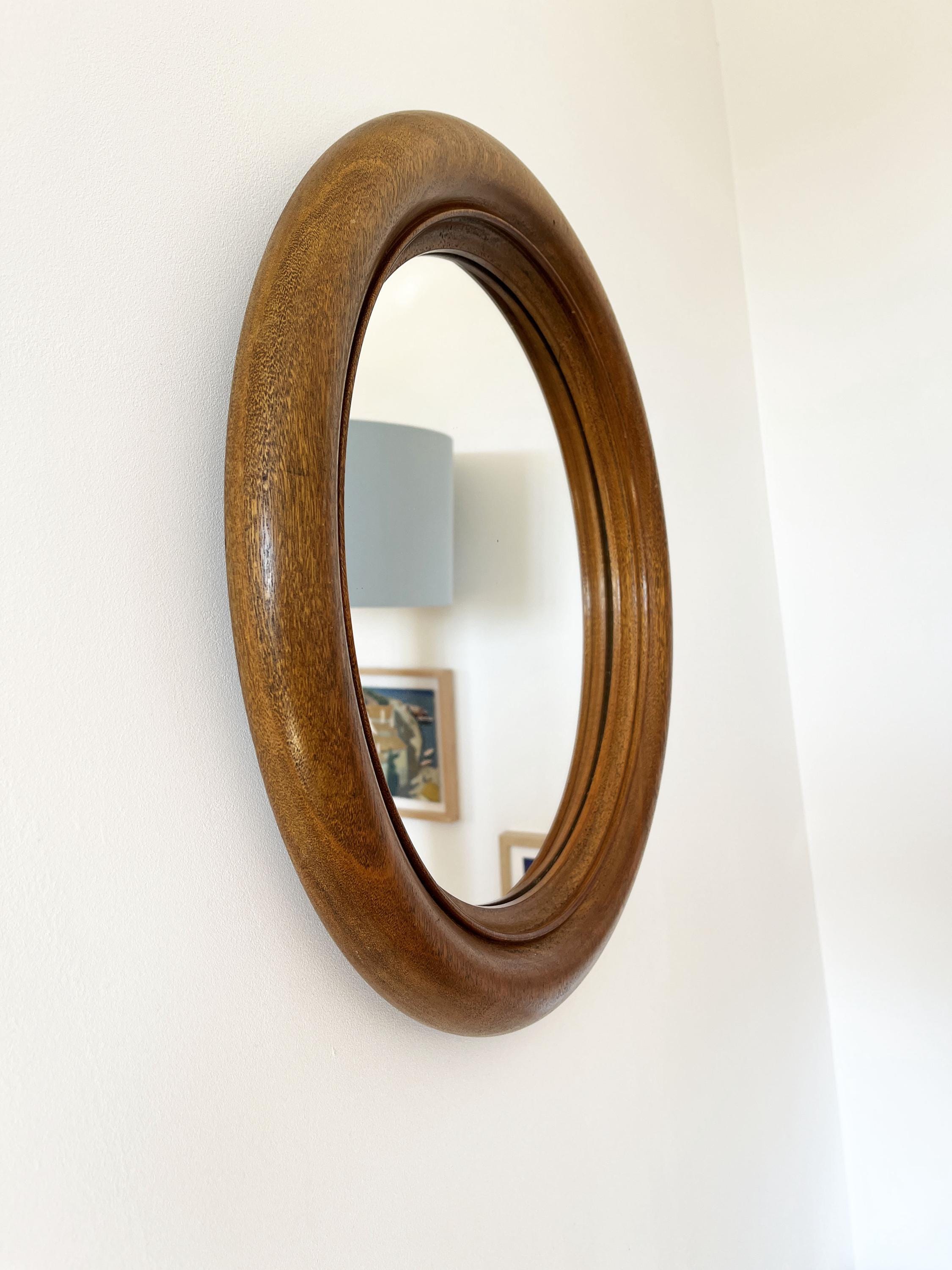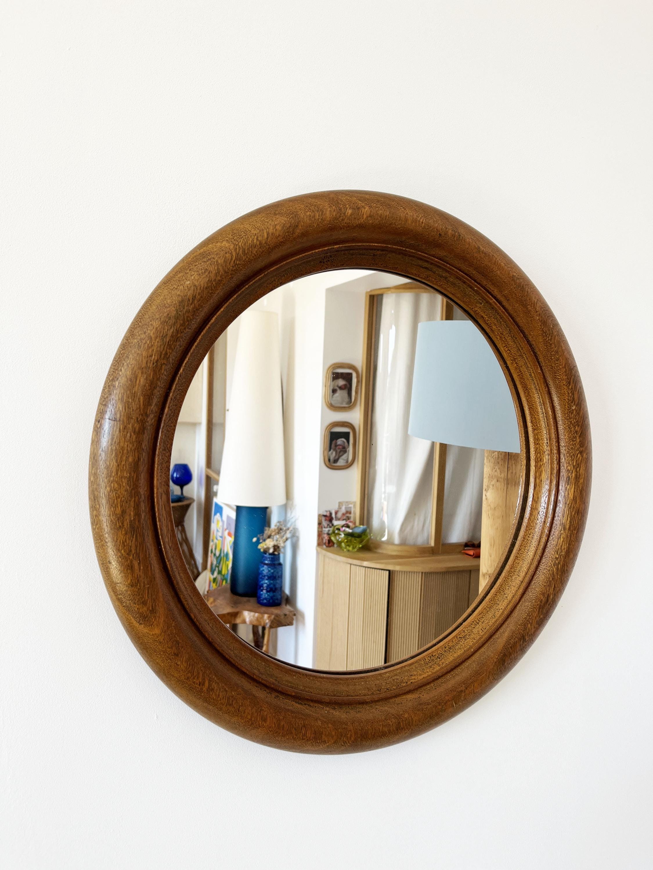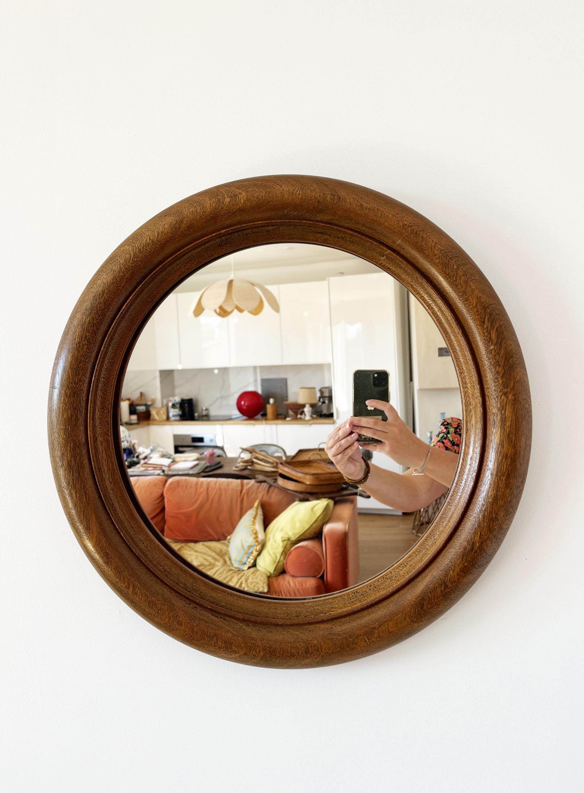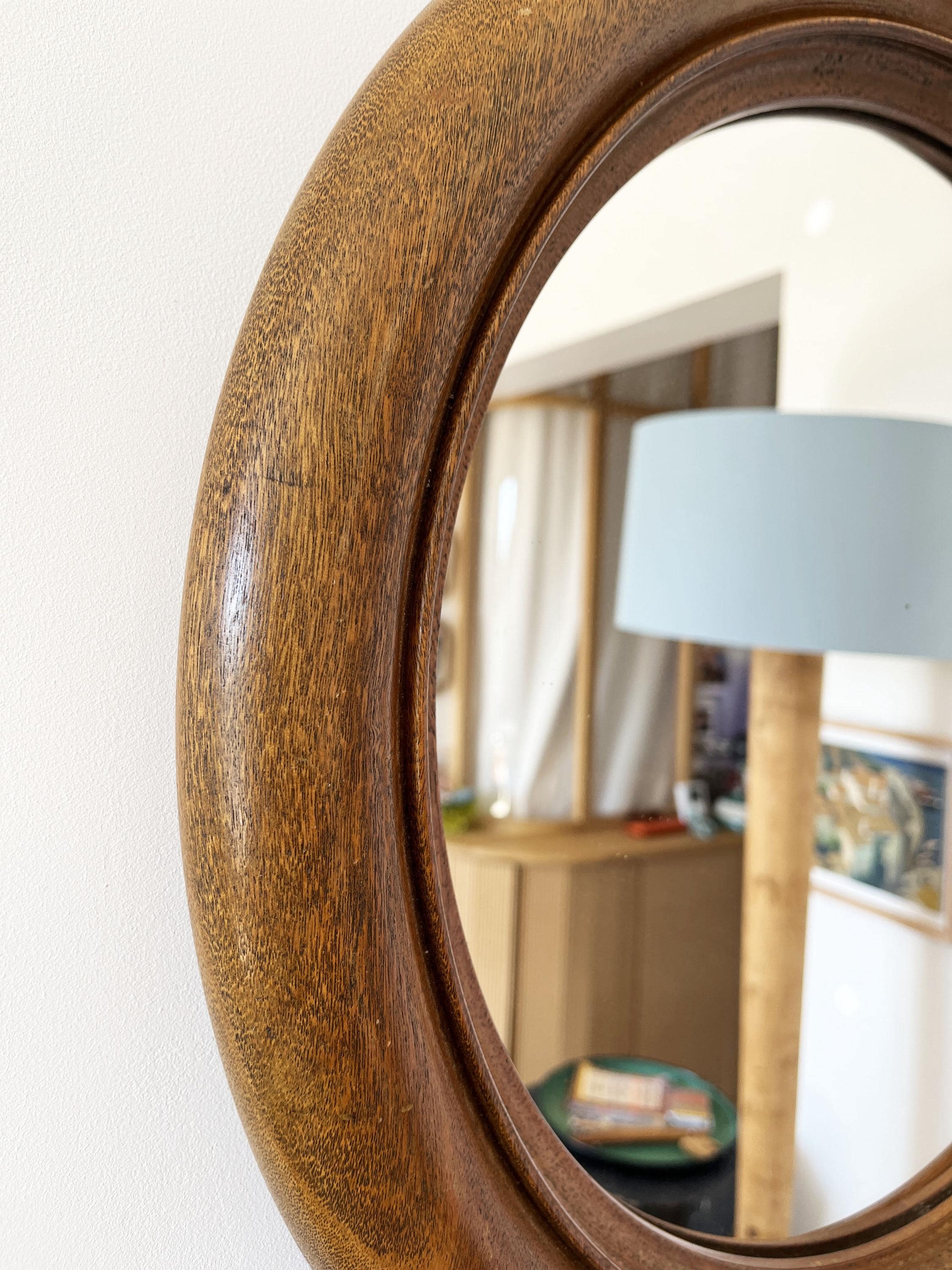Round mirror made of solid oak wood, antique, from the 1950s.