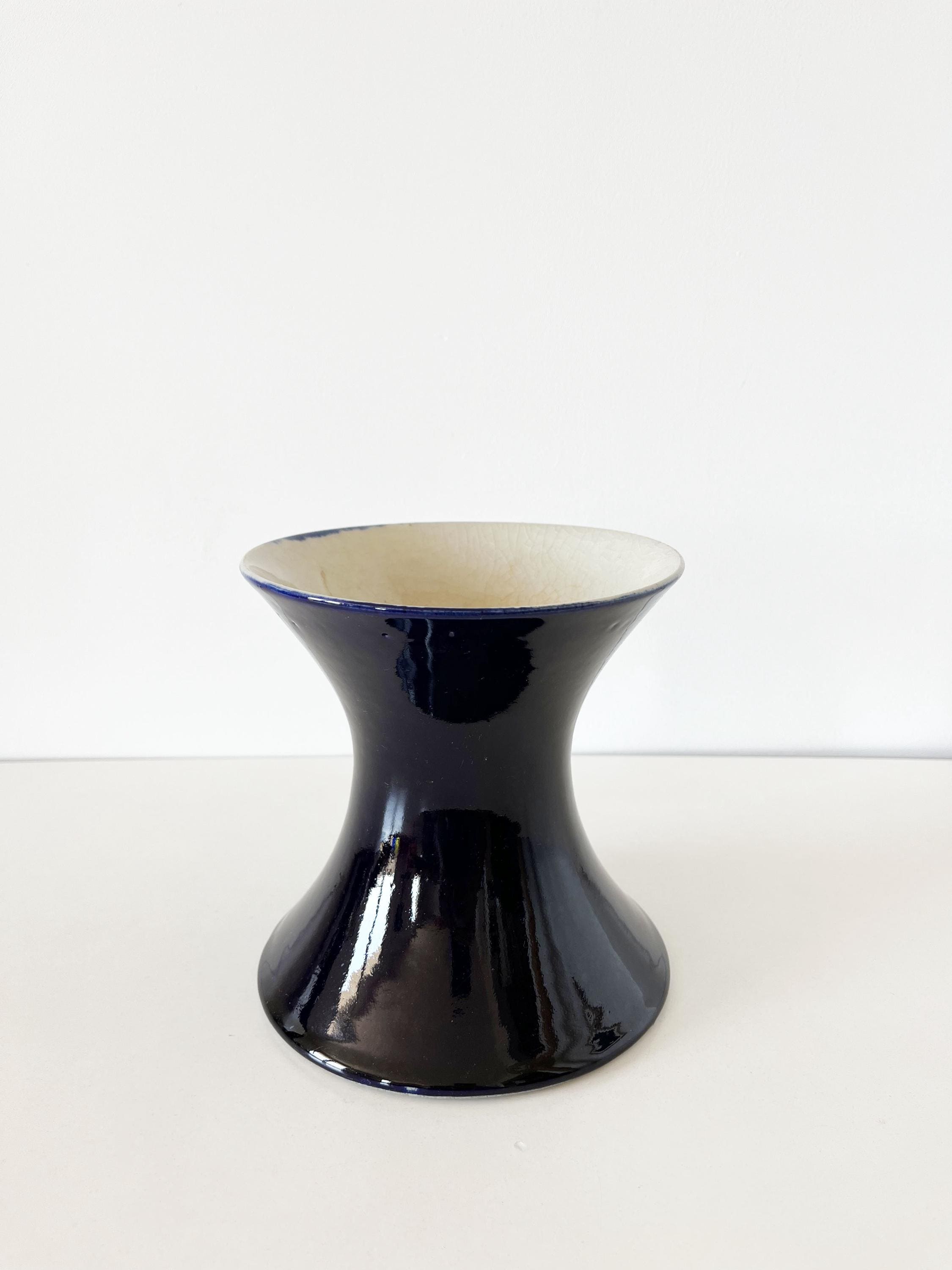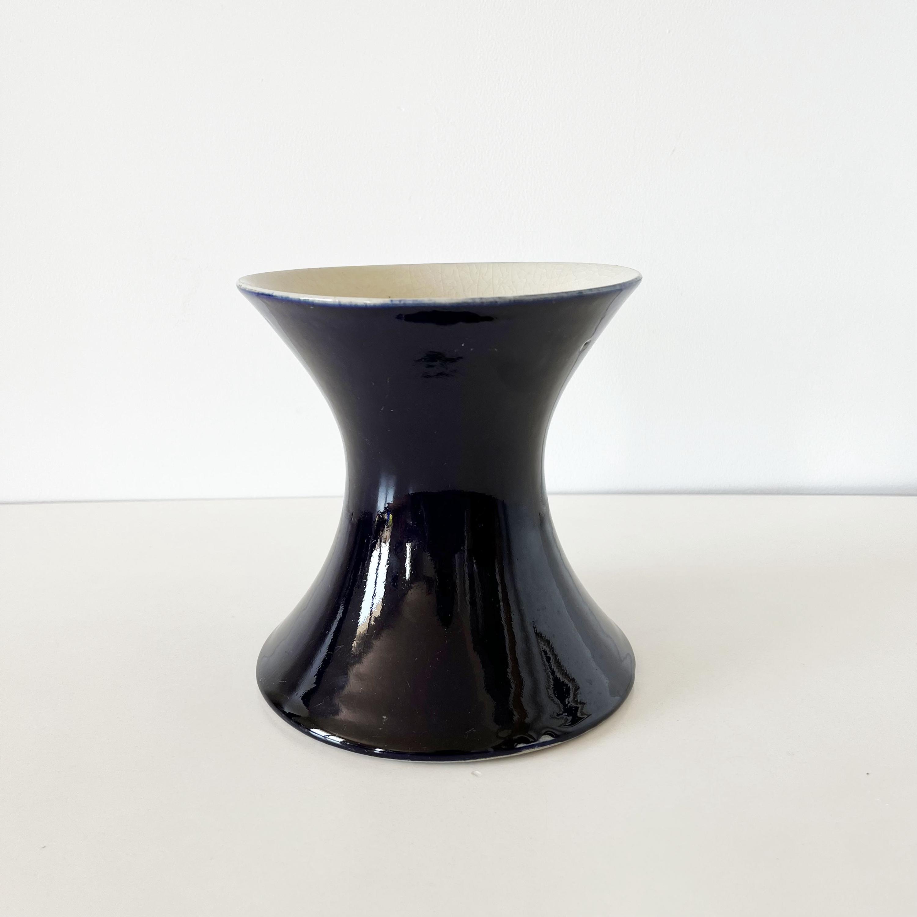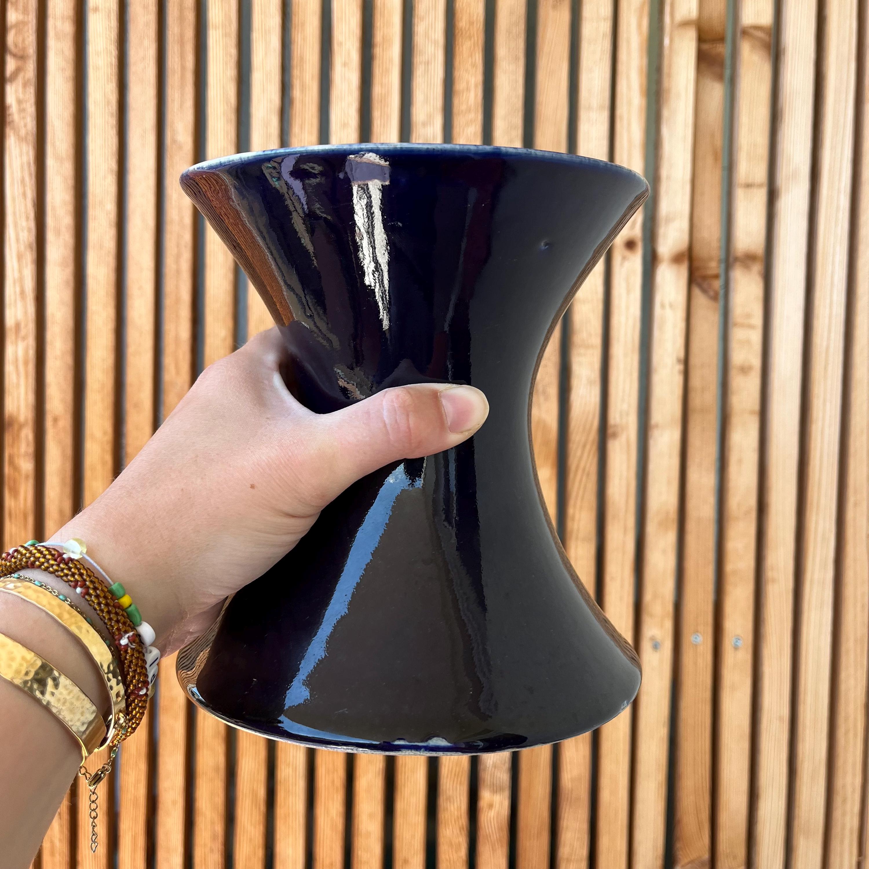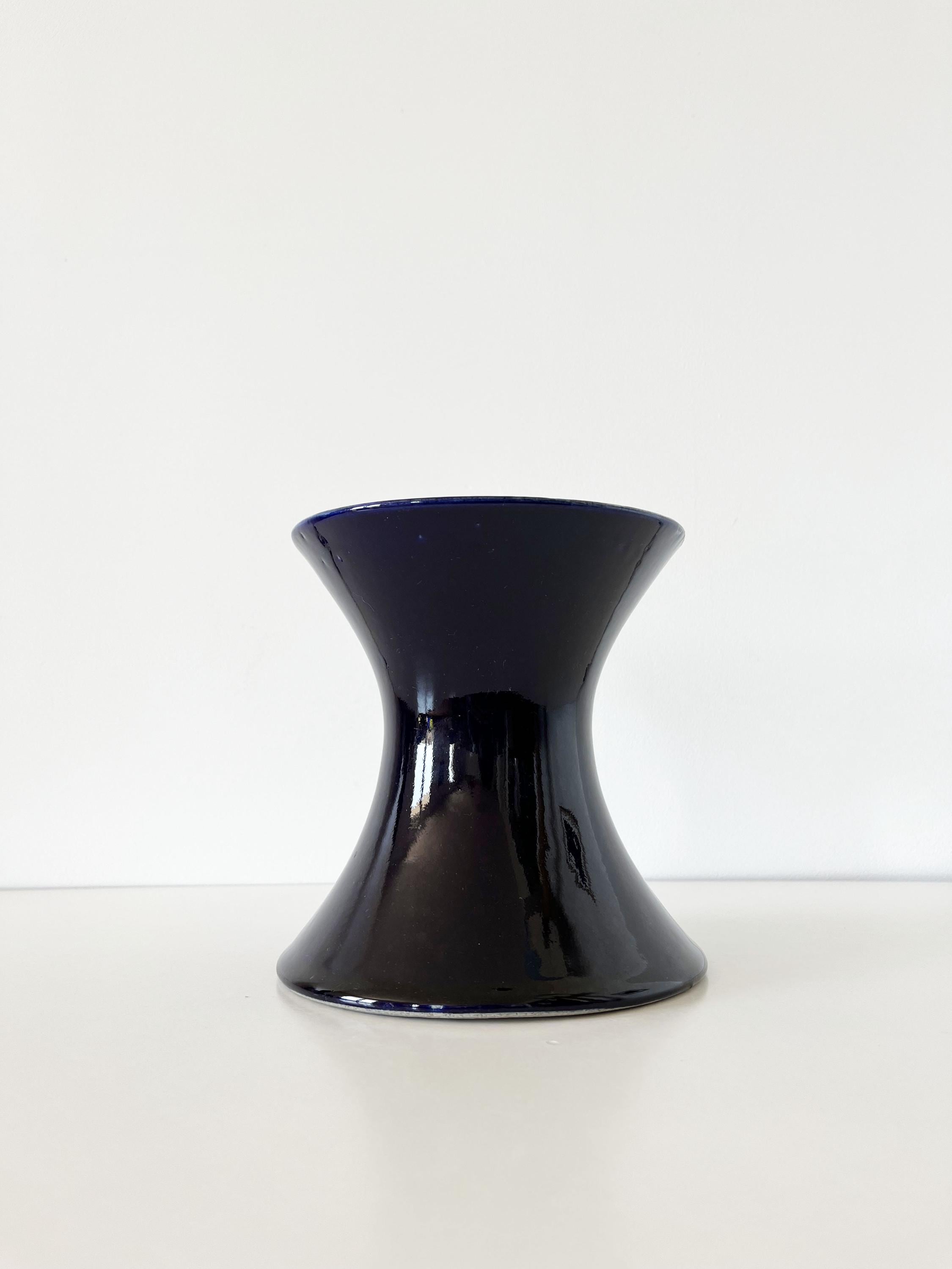 Navy blue ceramic vase in the shape of a diabolo from the 1950s