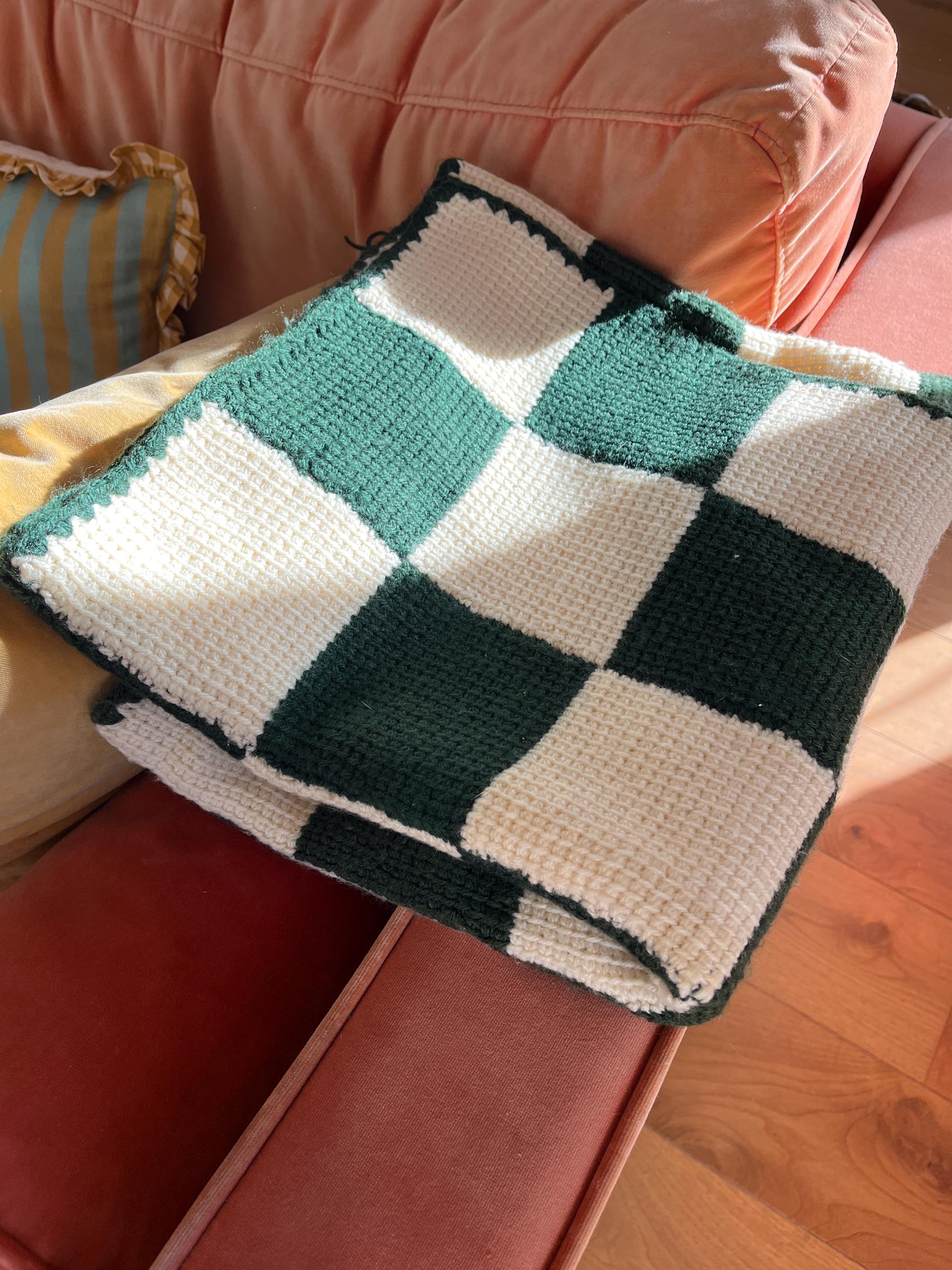 Gingham blanket, or handmade and vintage knitted wool throw.