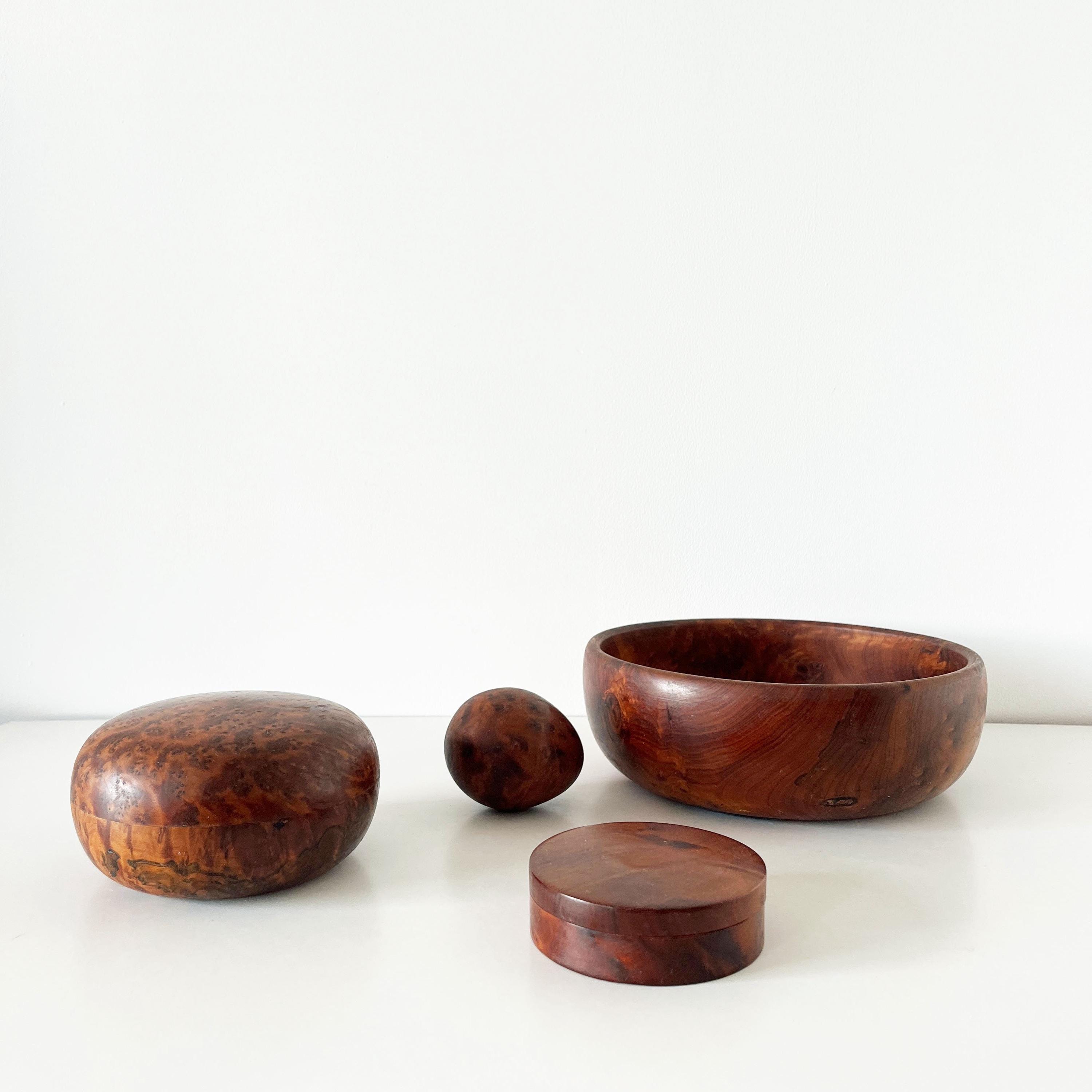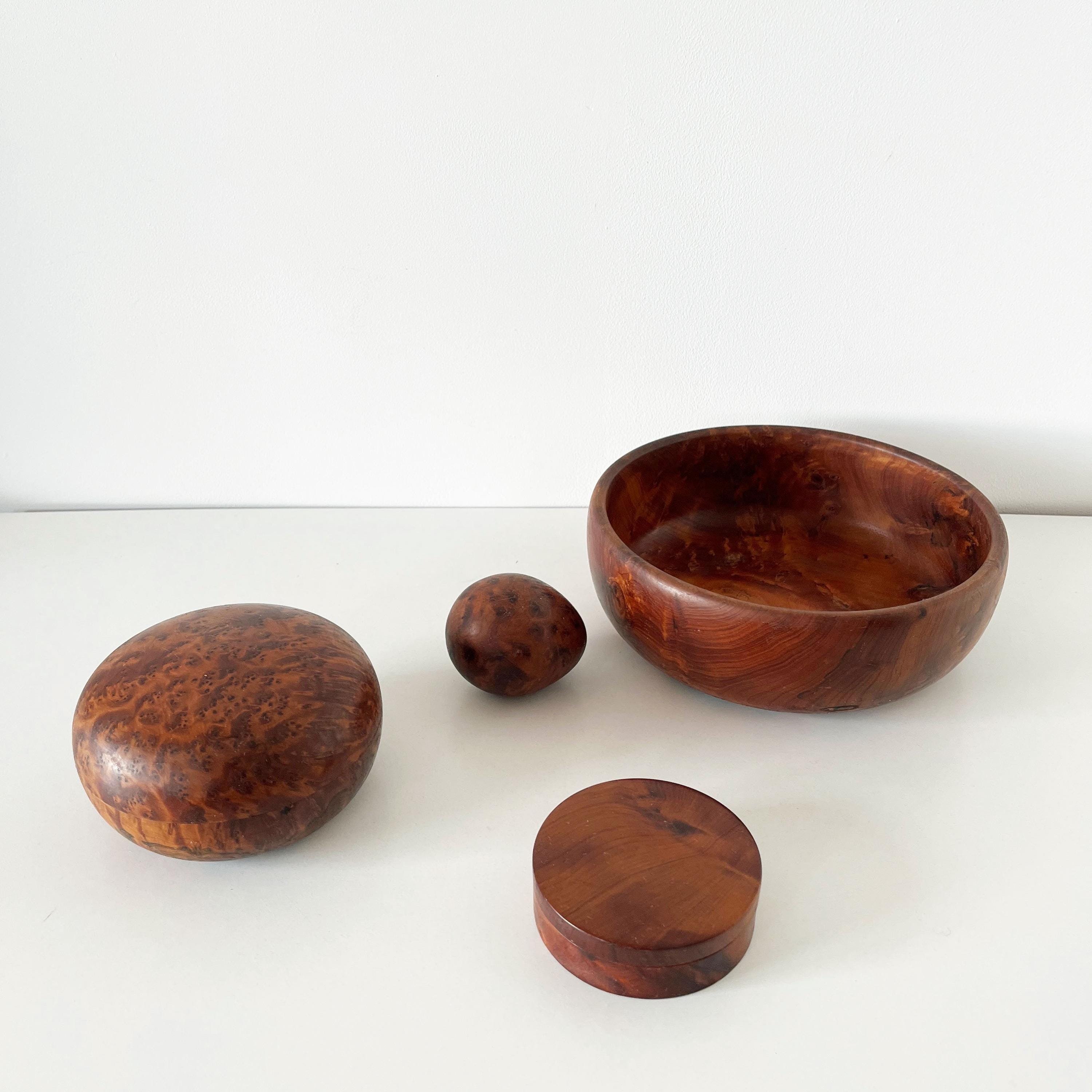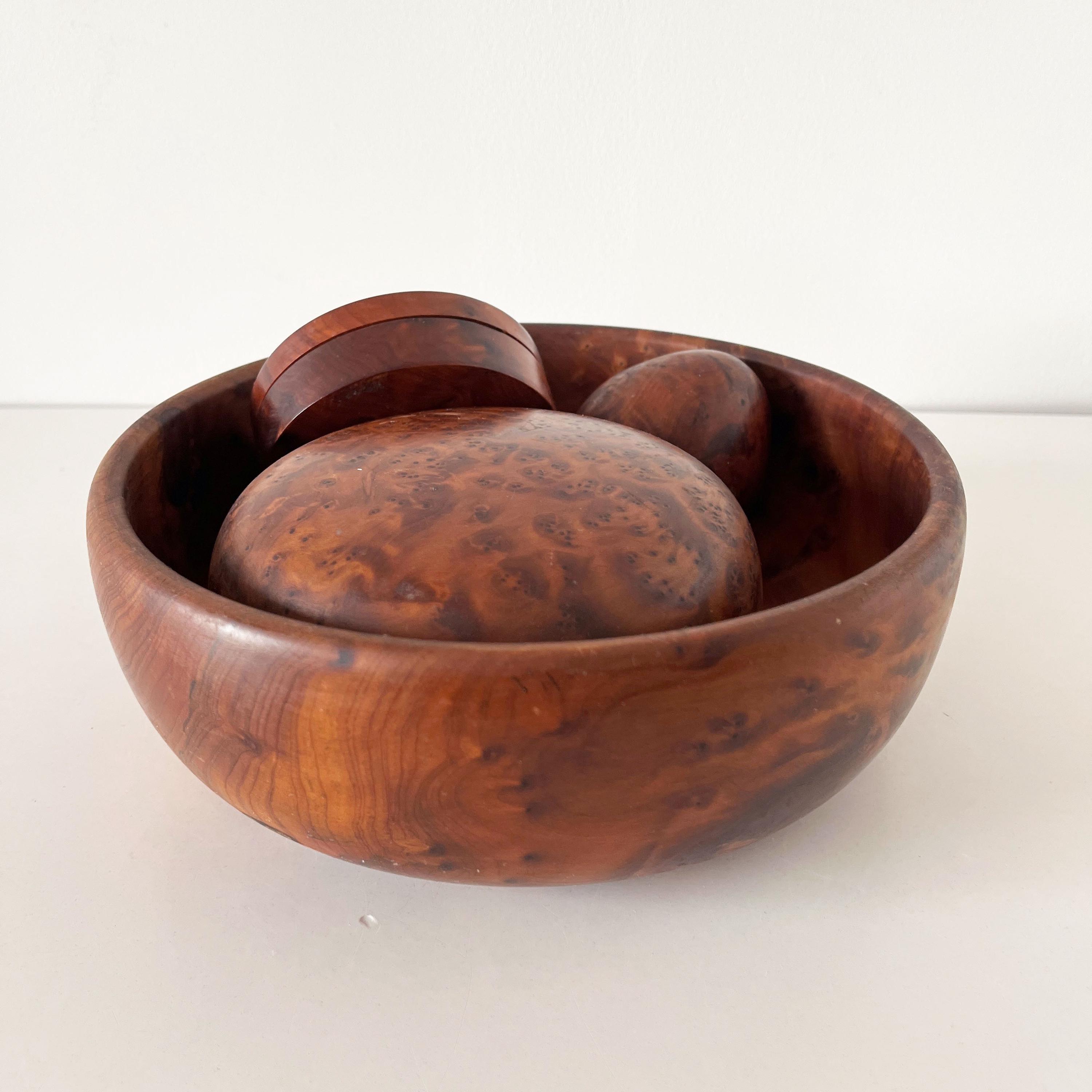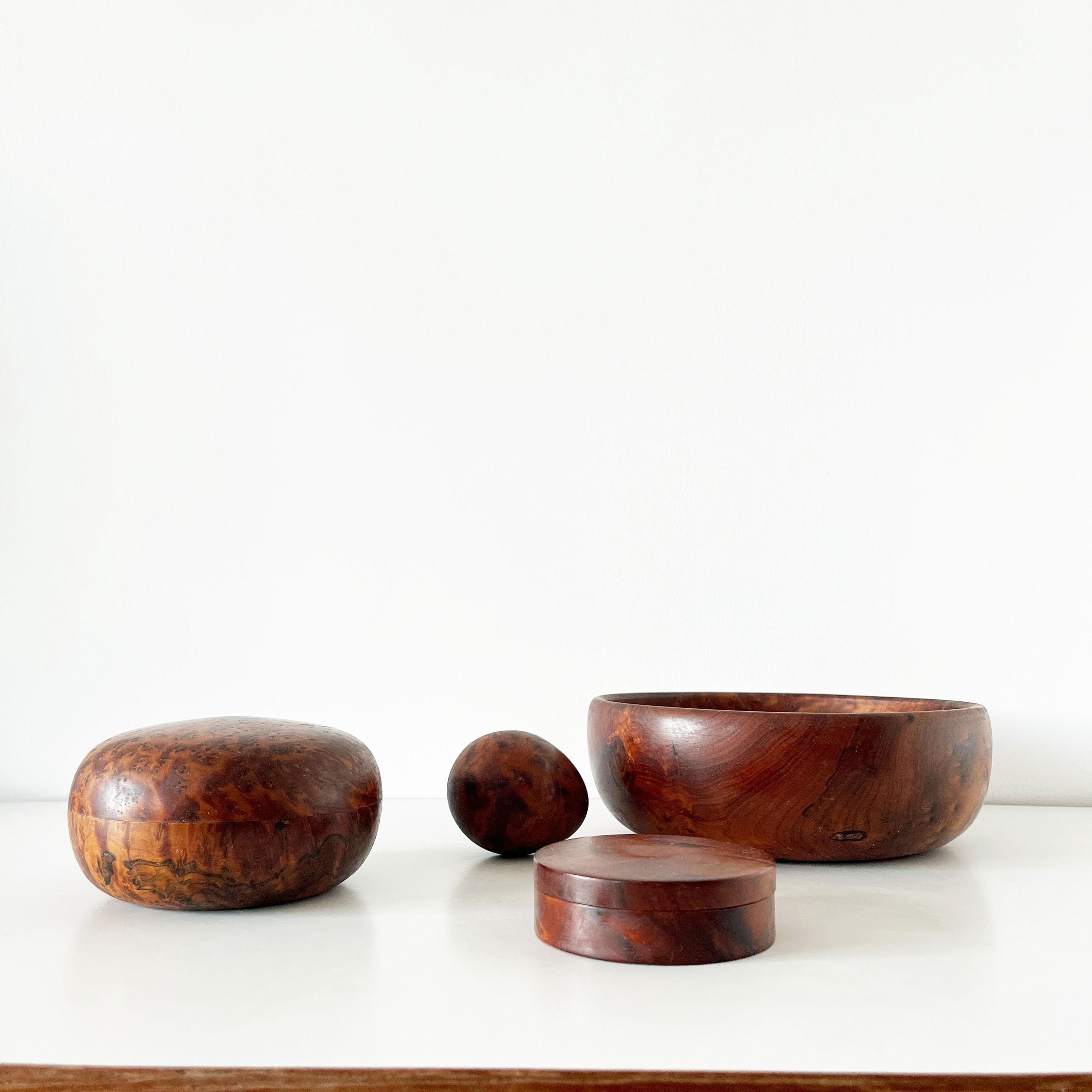 Set of cutting boards and boxes in solid wood, made of elm burl, from the 1970s