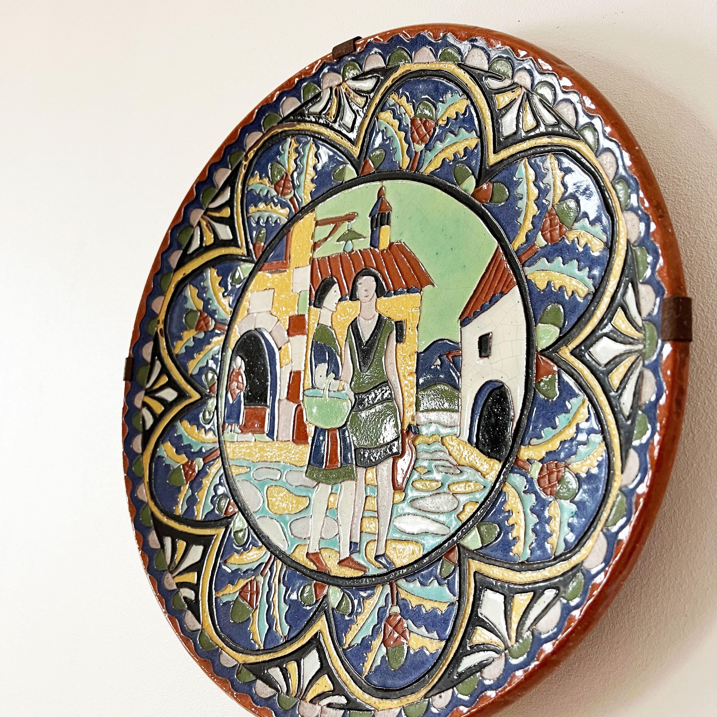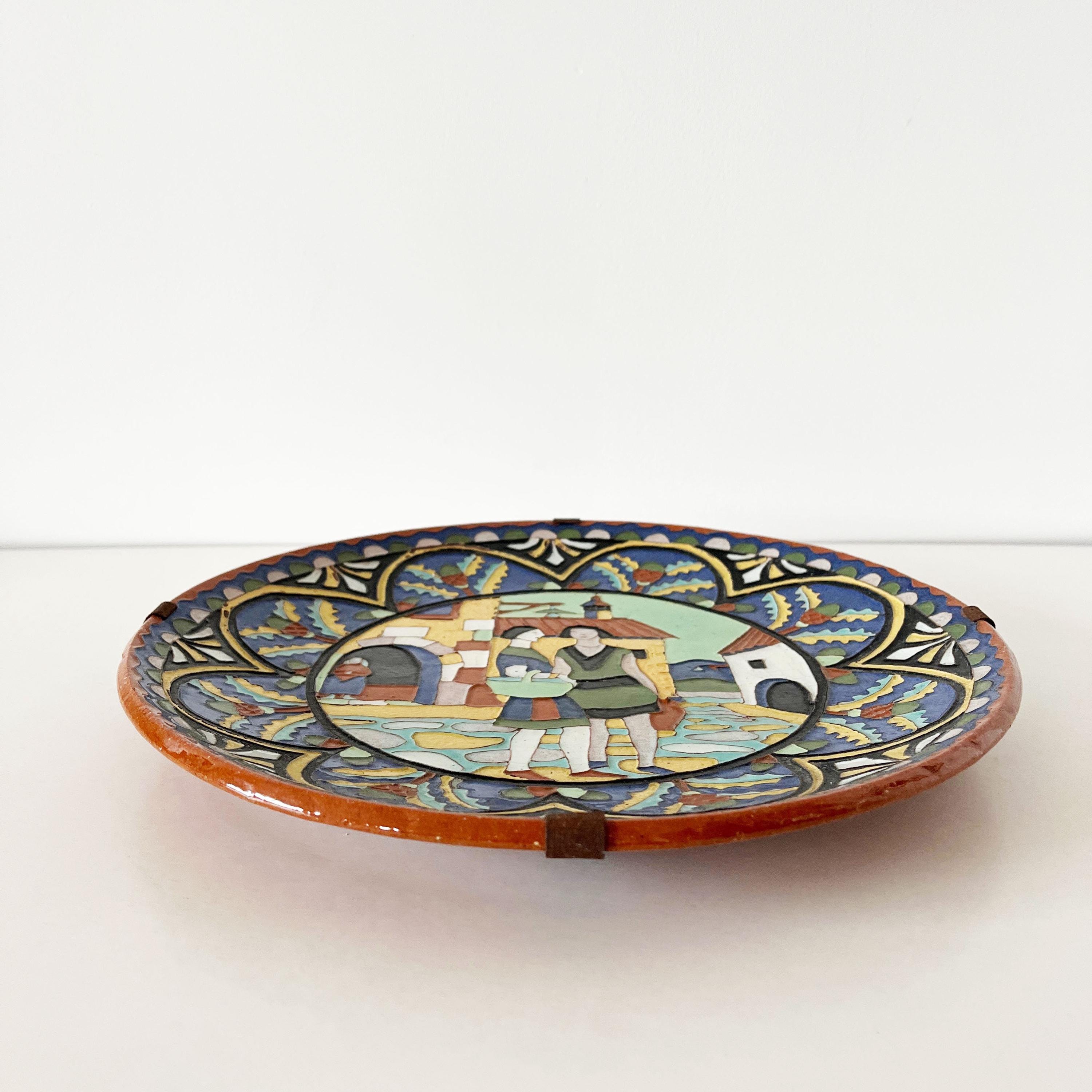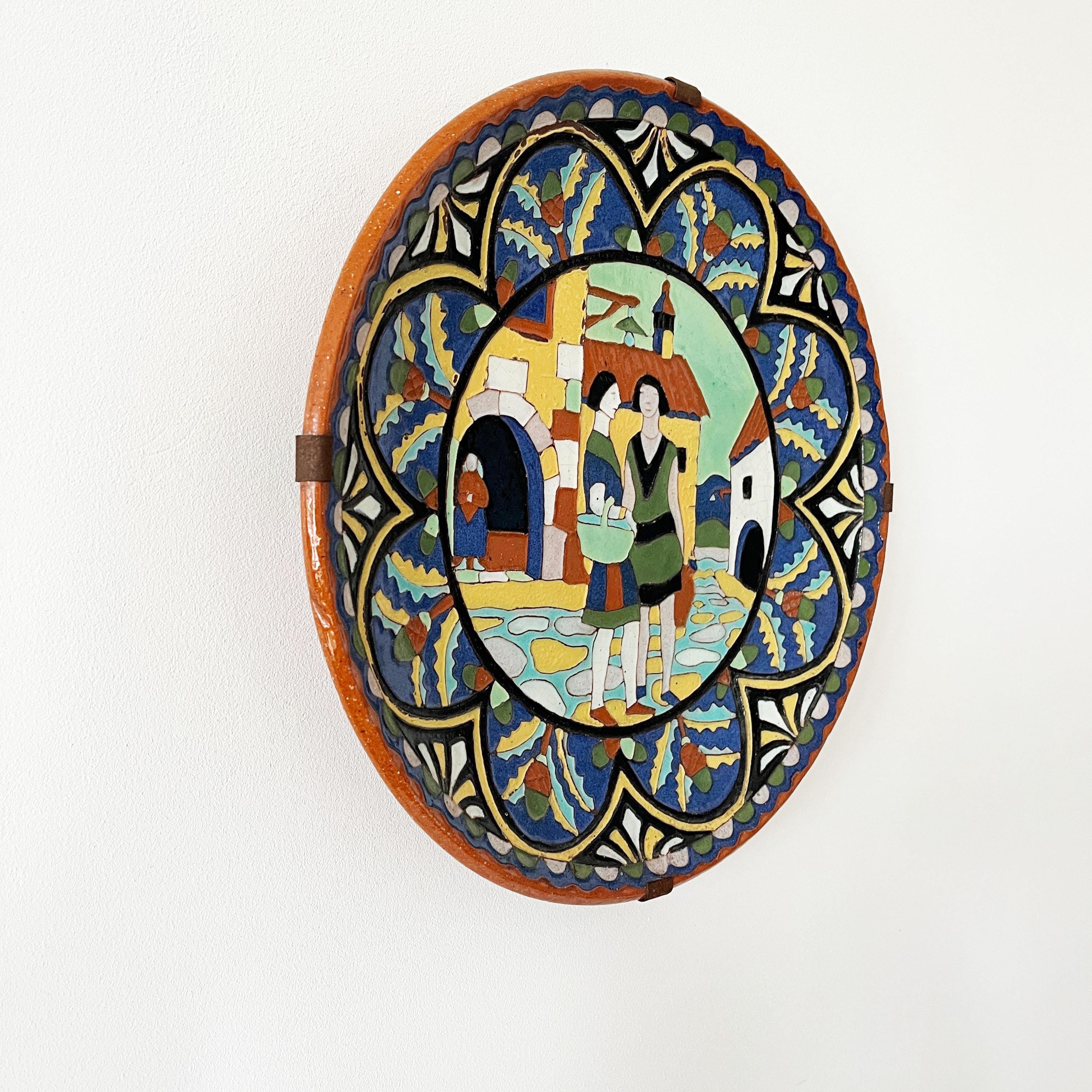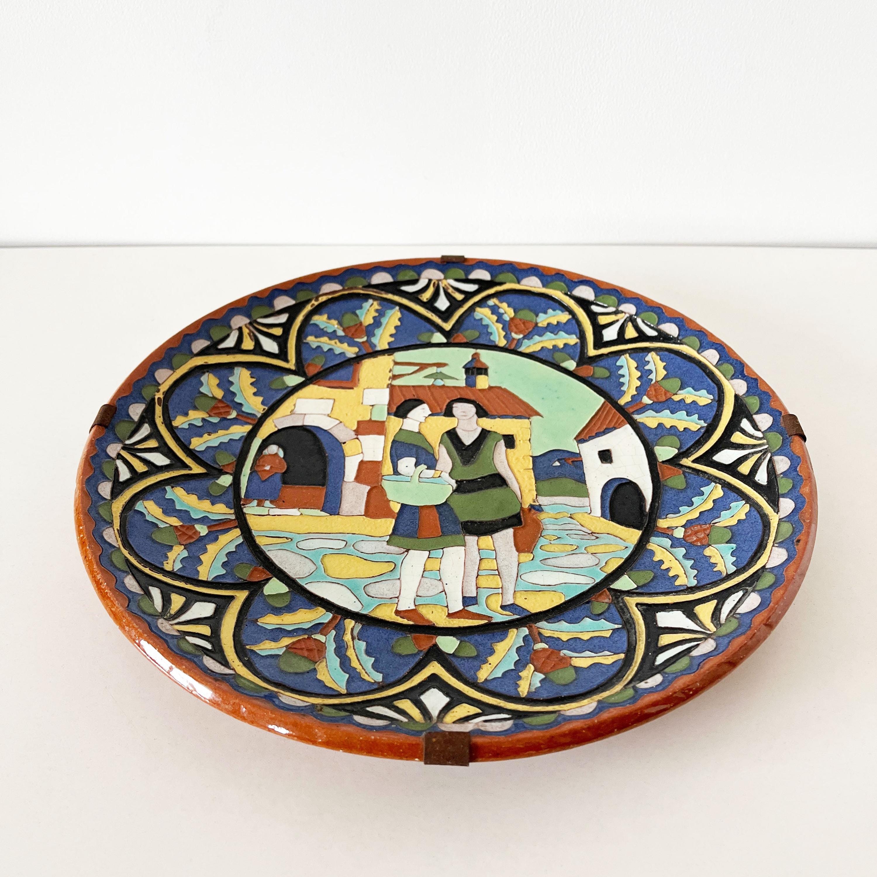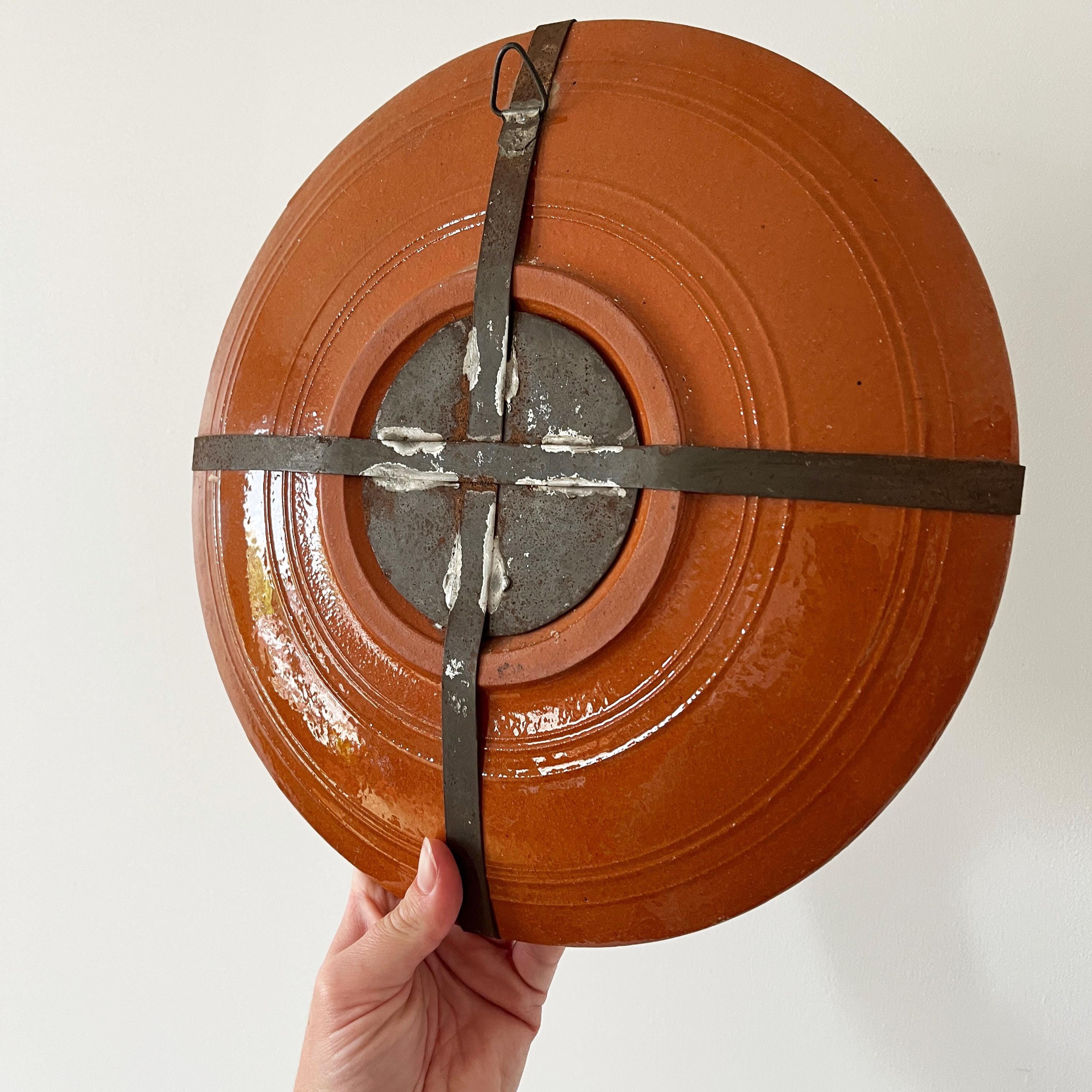Large round vintage terracotta dish from the 1960s, handcrafted pottery.
