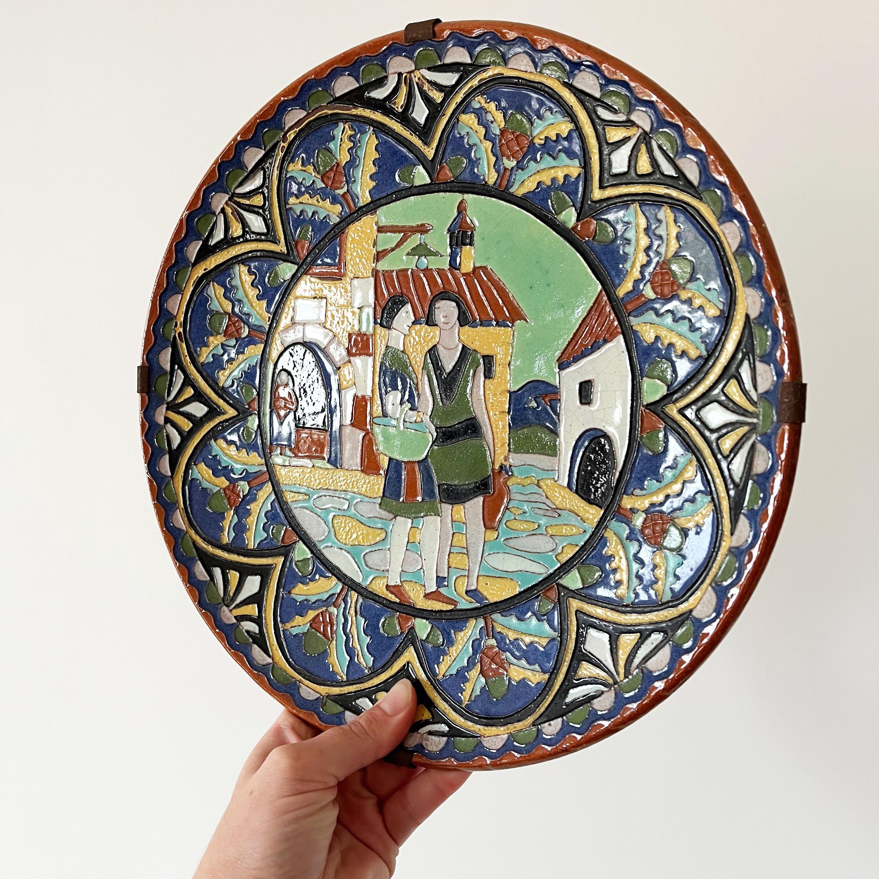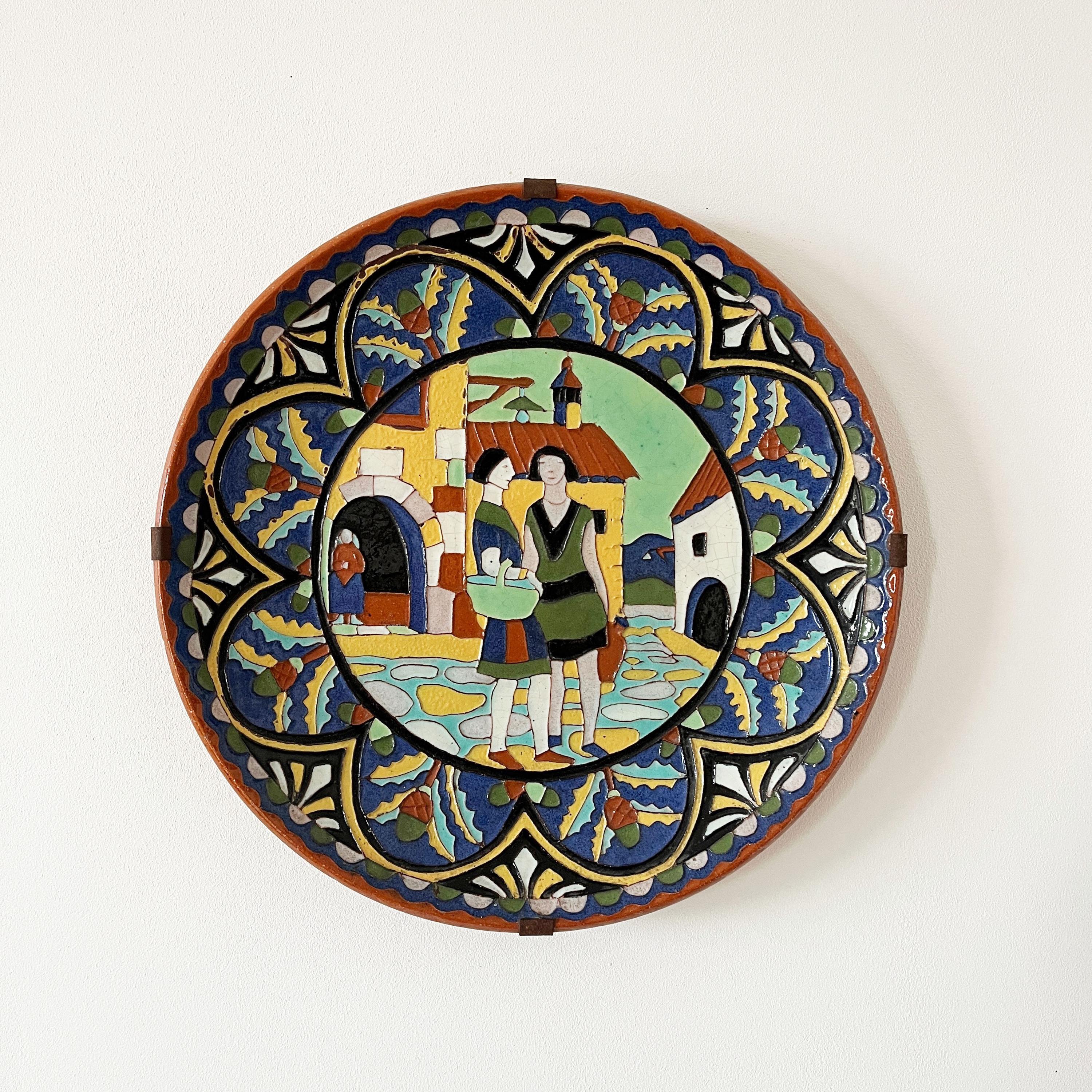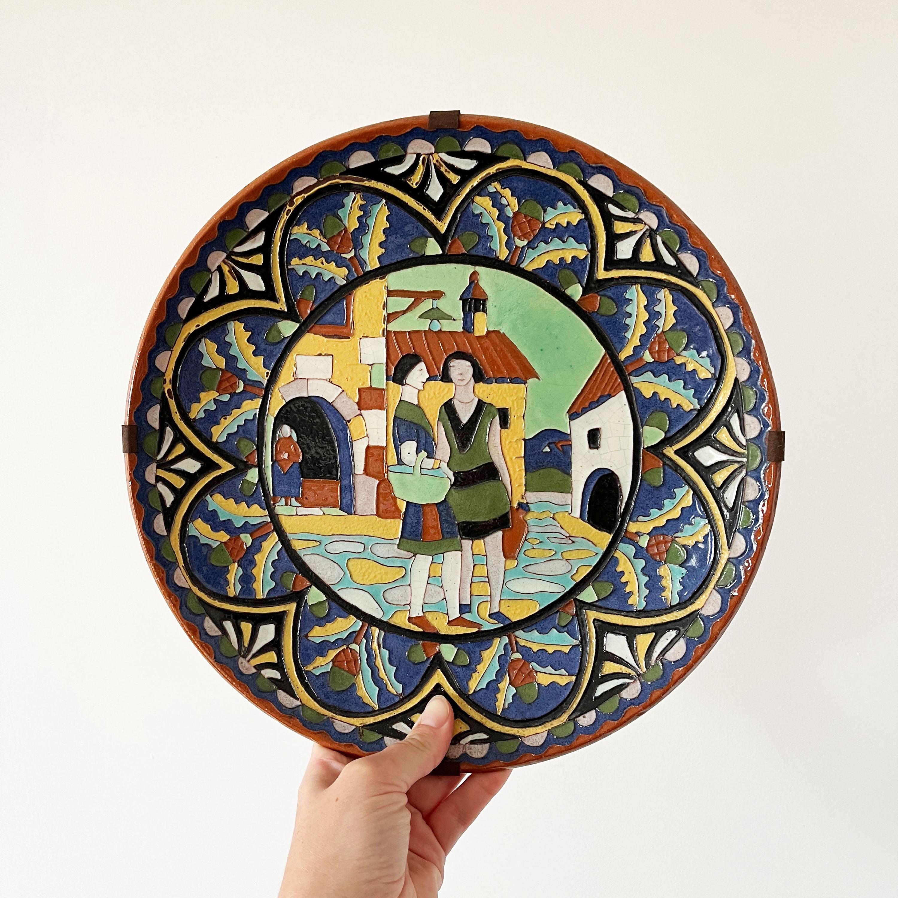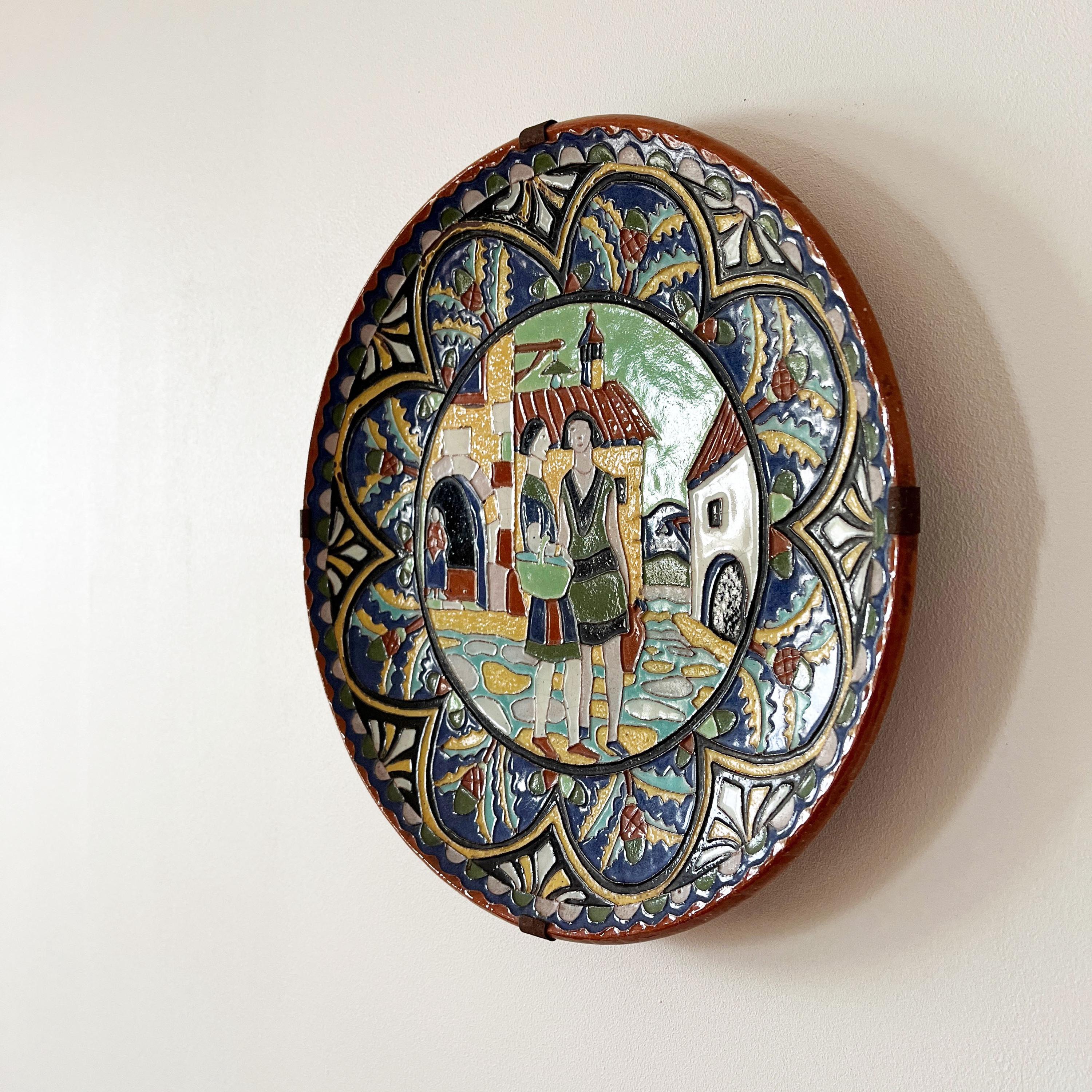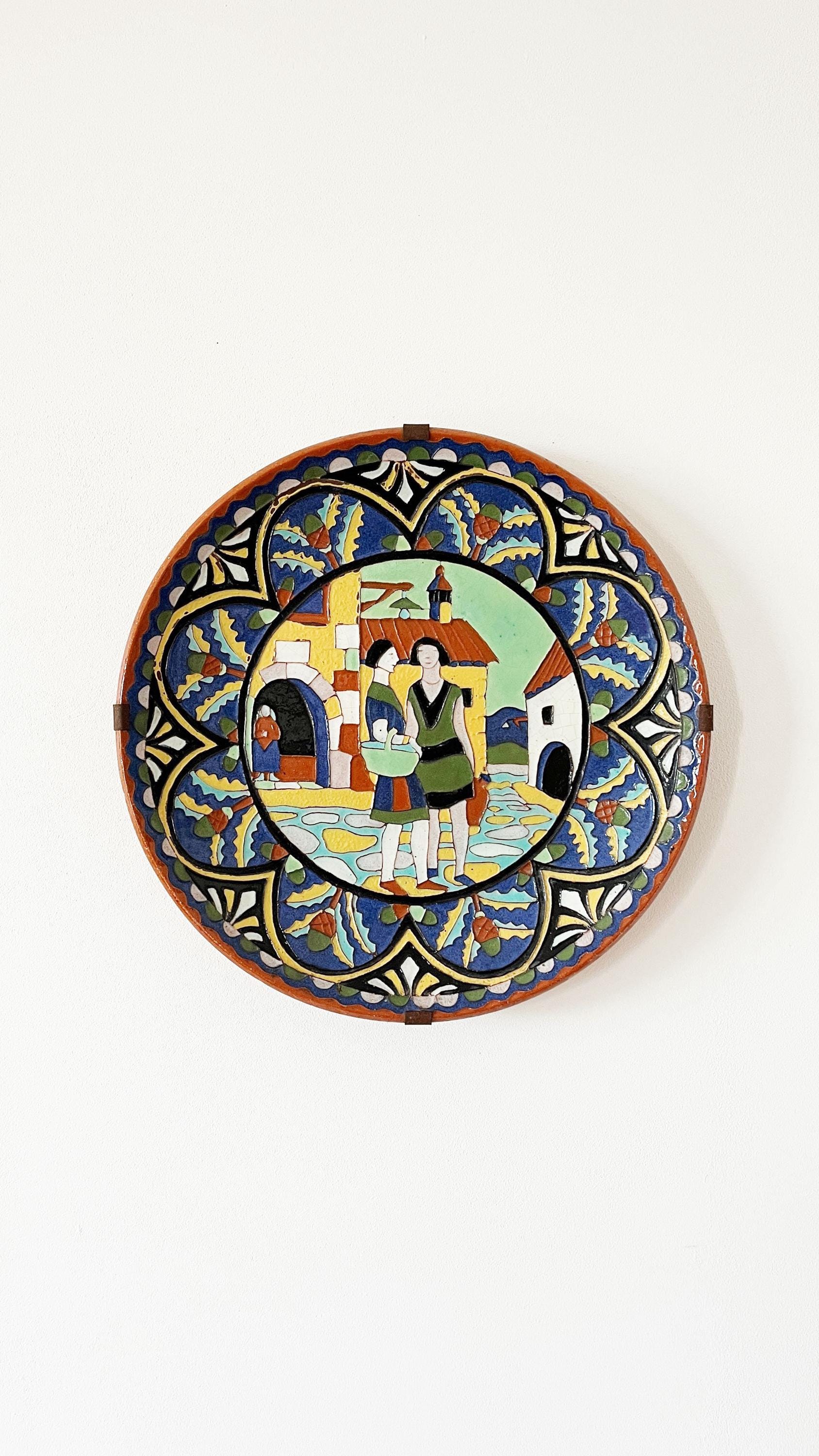 Large round vintage terracotta dish from the 1960s, handcrafted pottery.