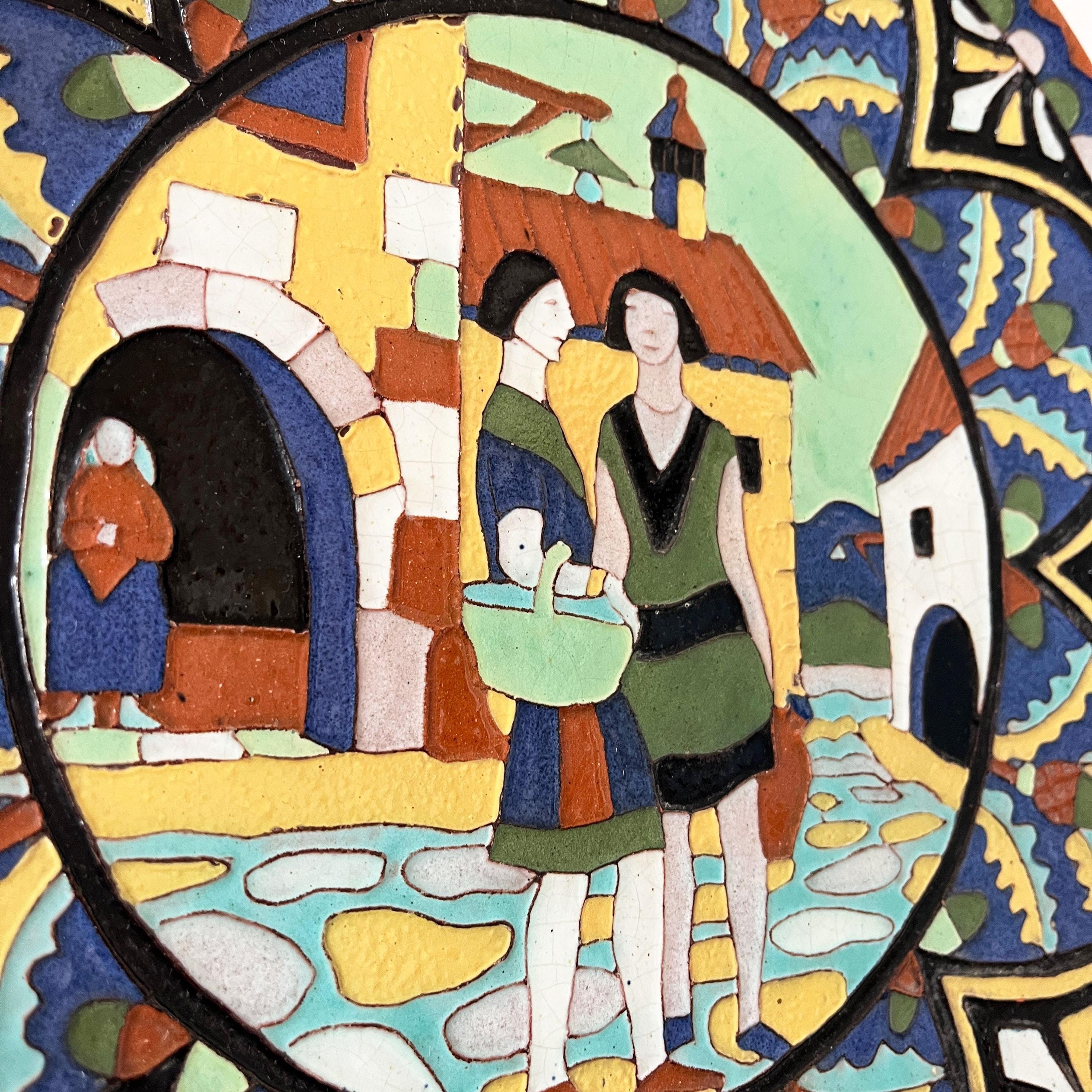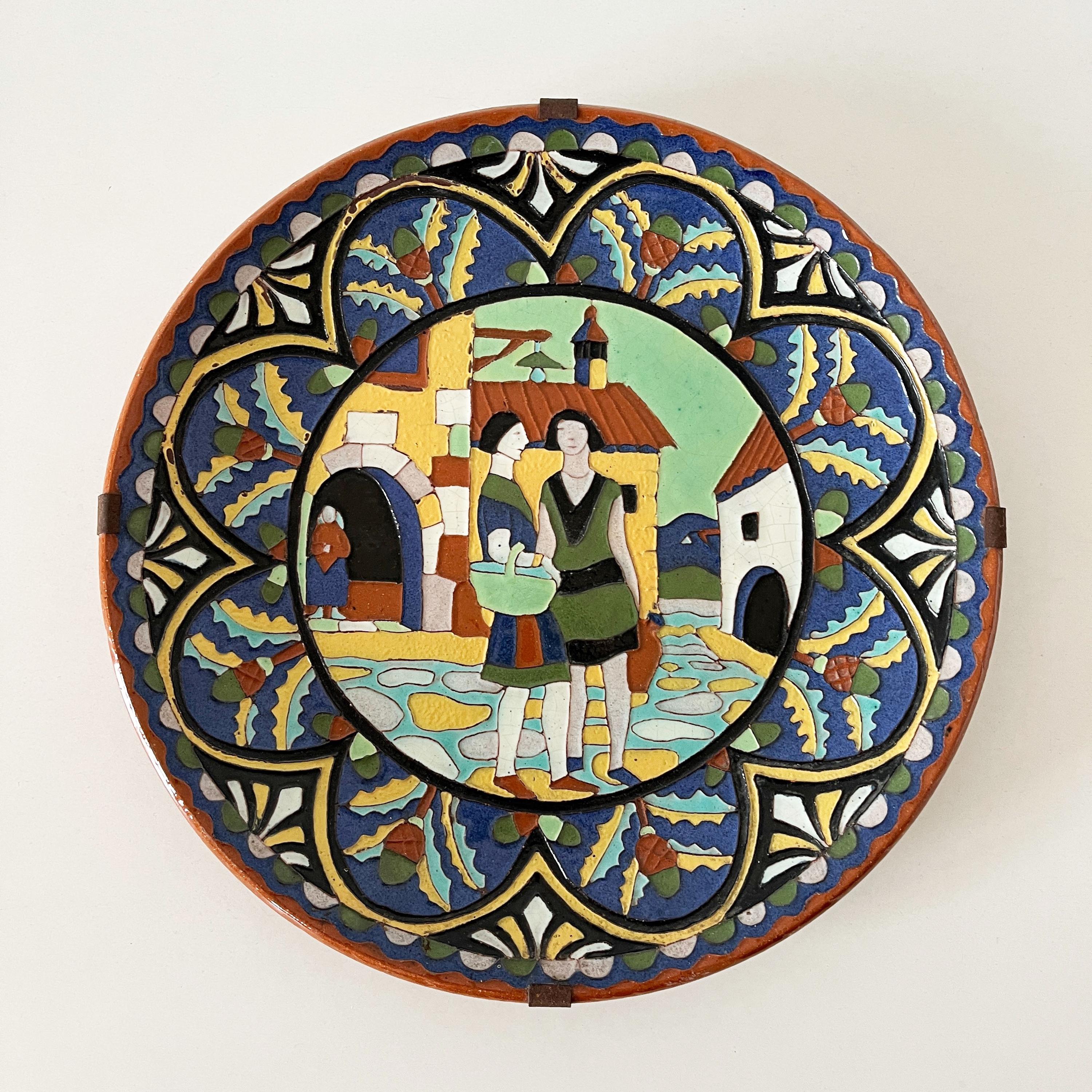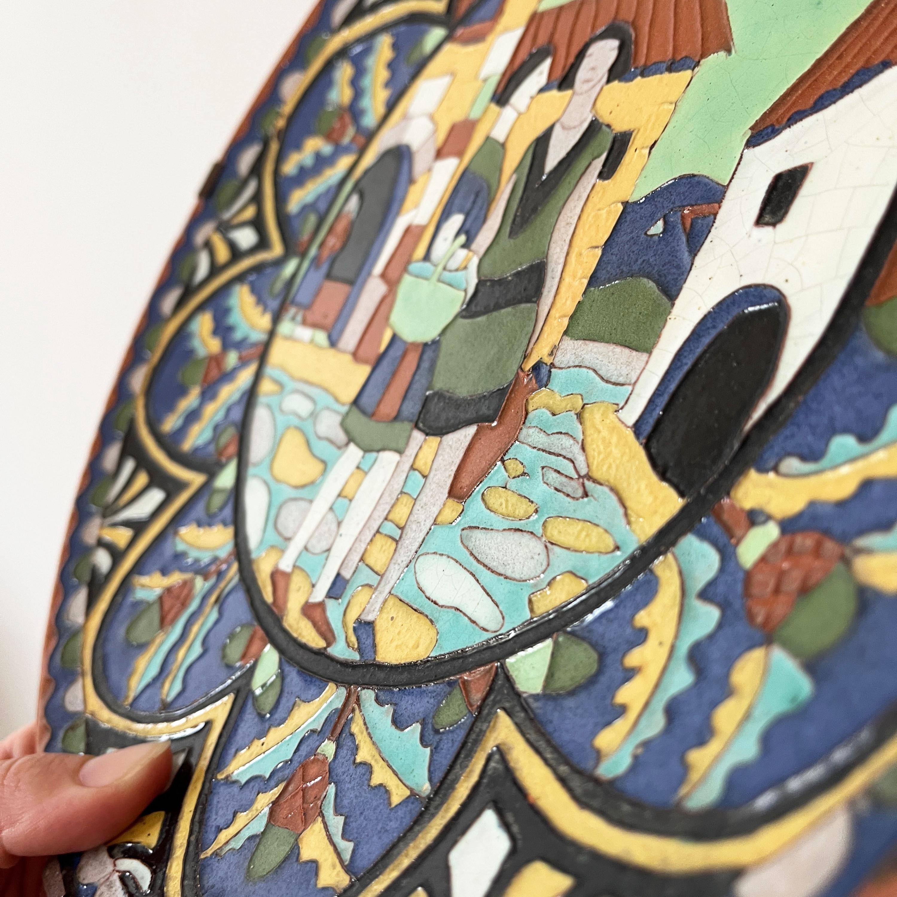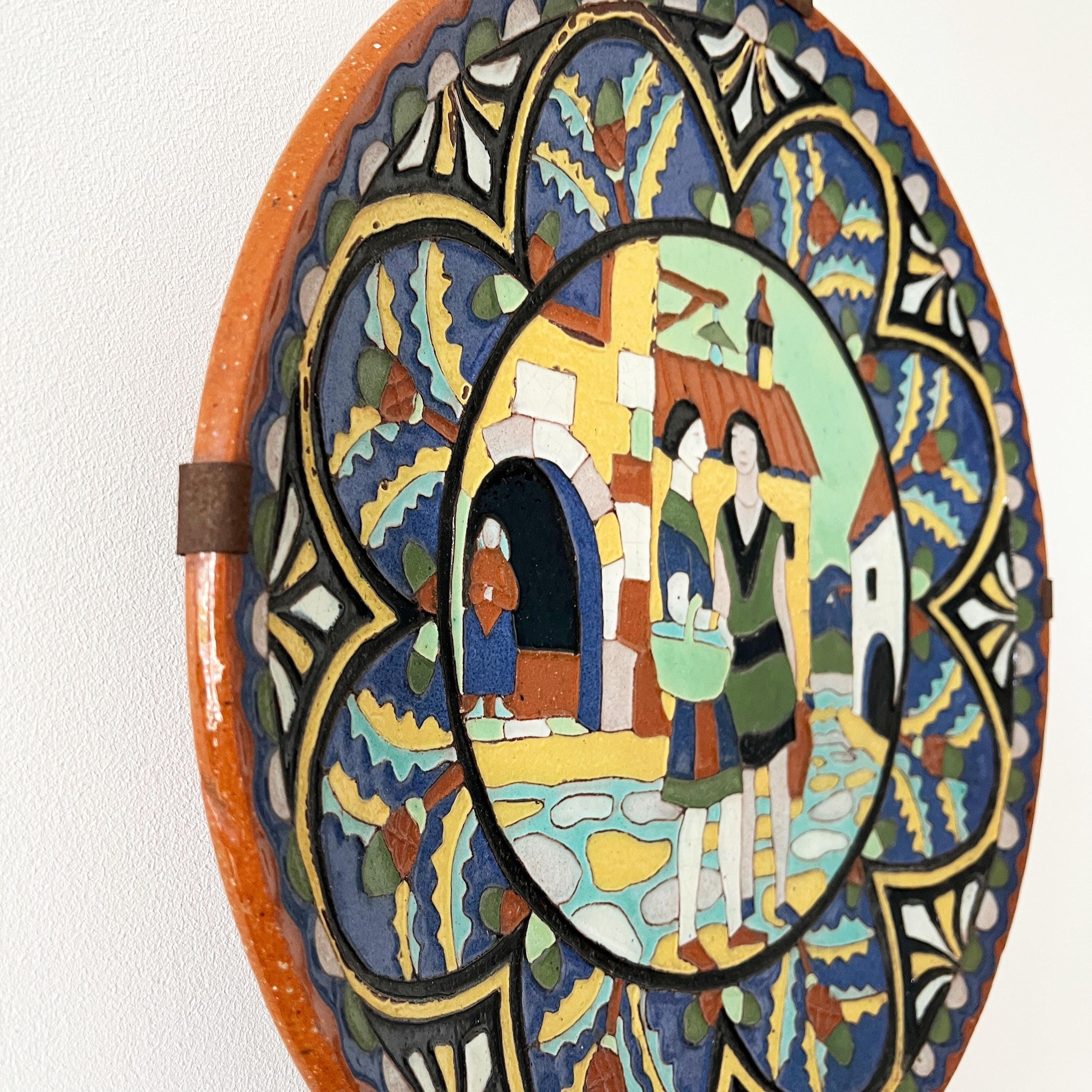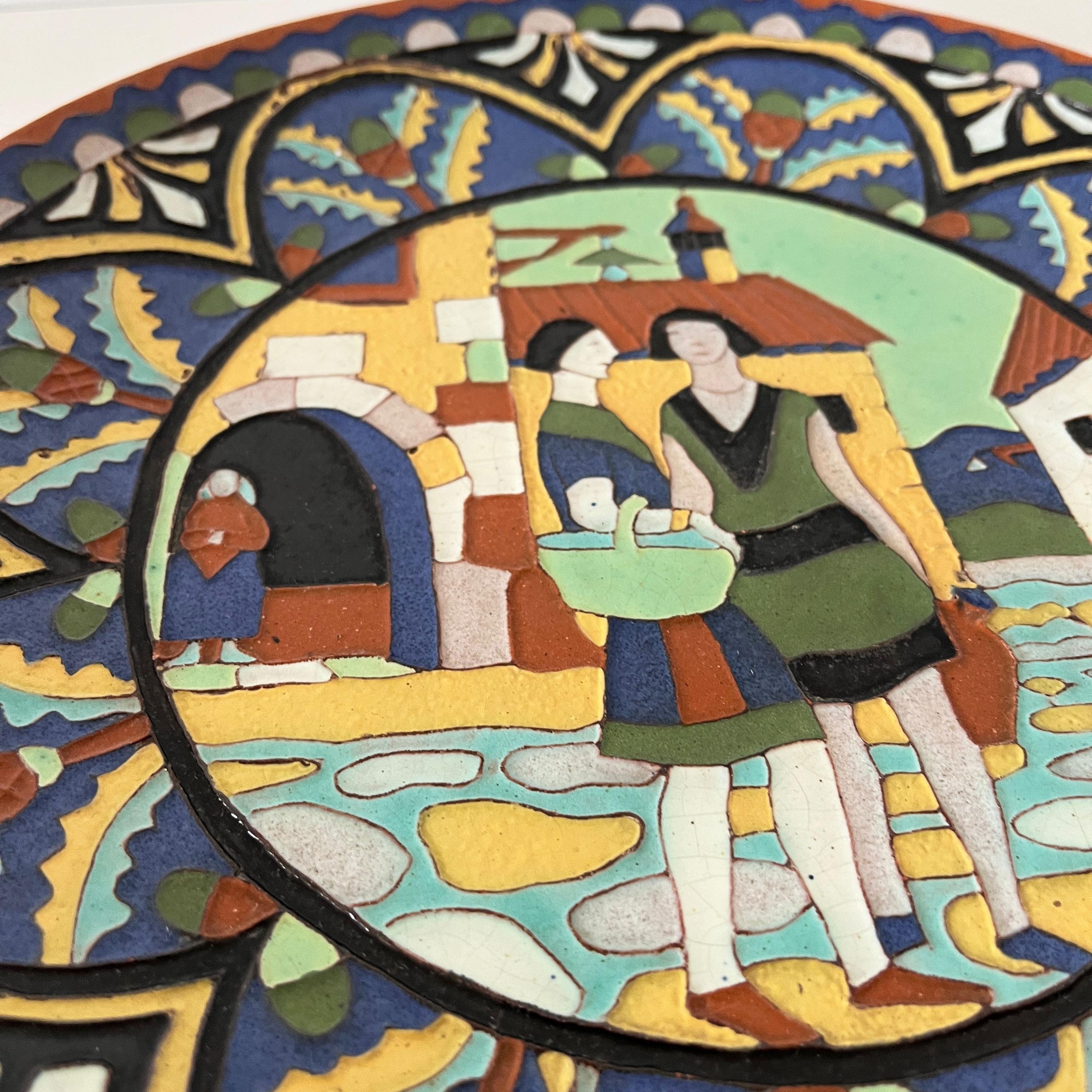 Large round vintage terracotta dish from the 1960s, handcrafted pottery.
