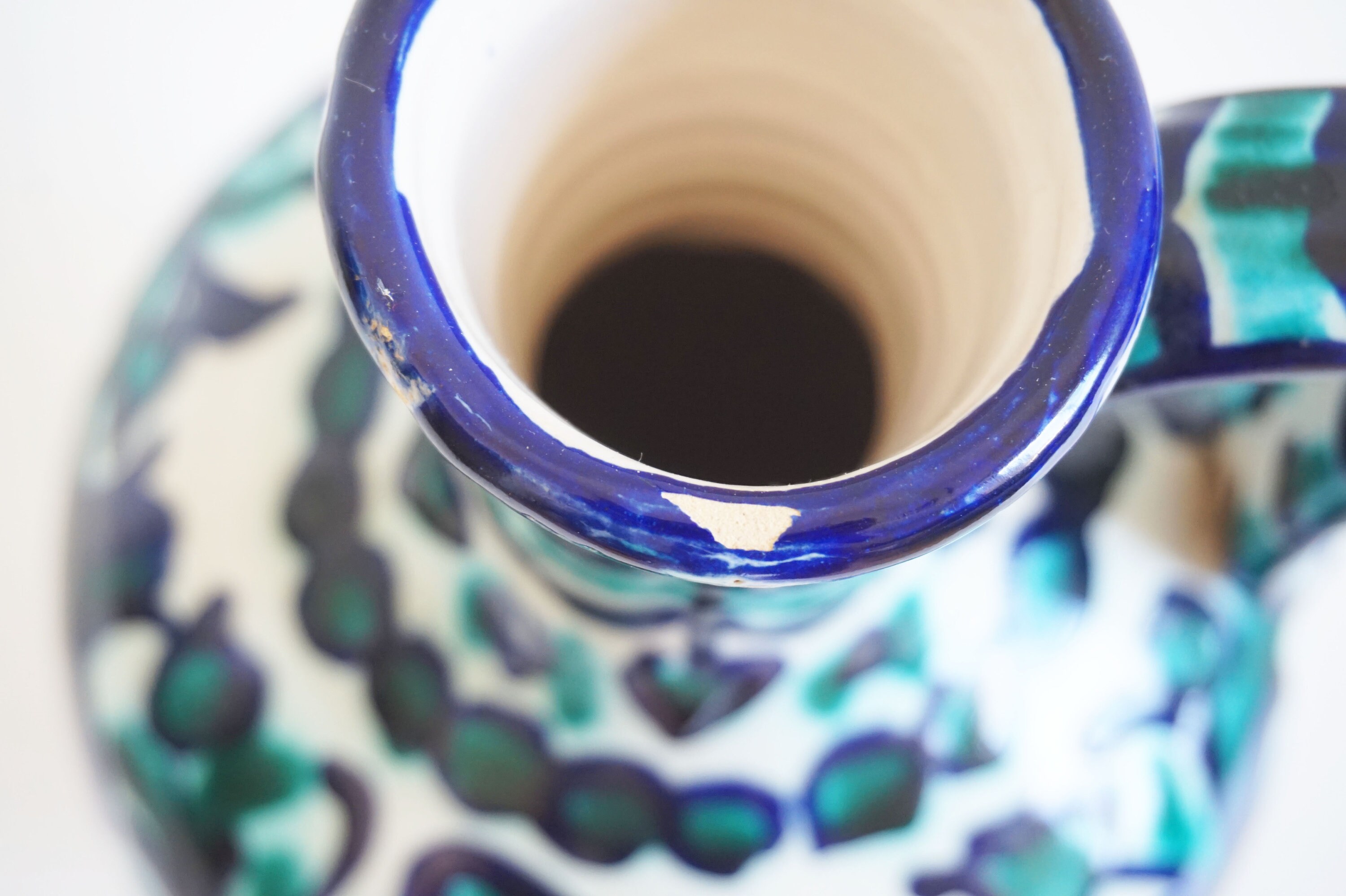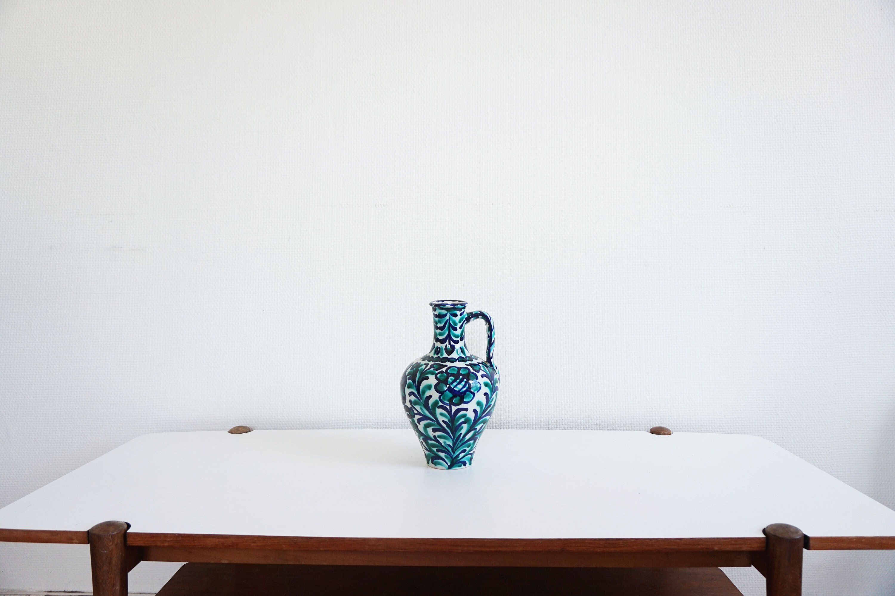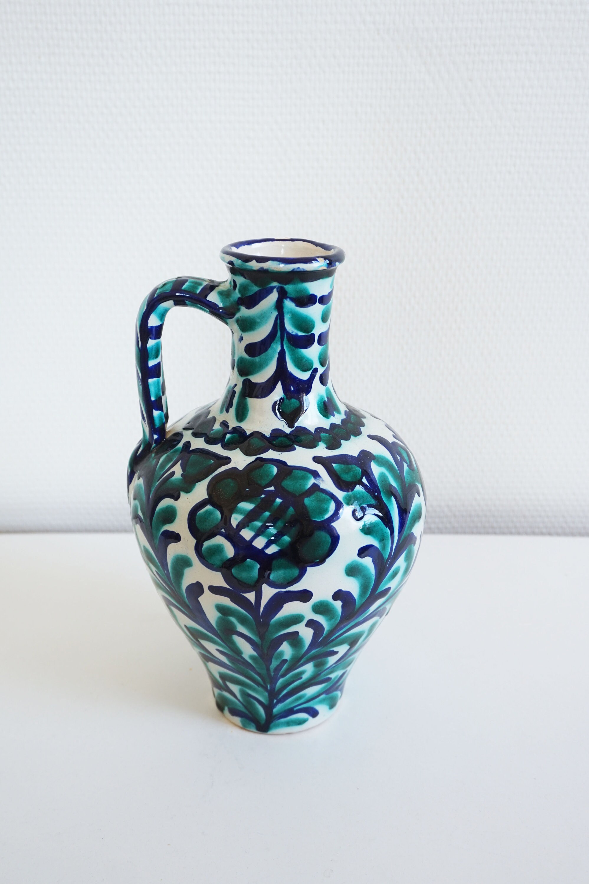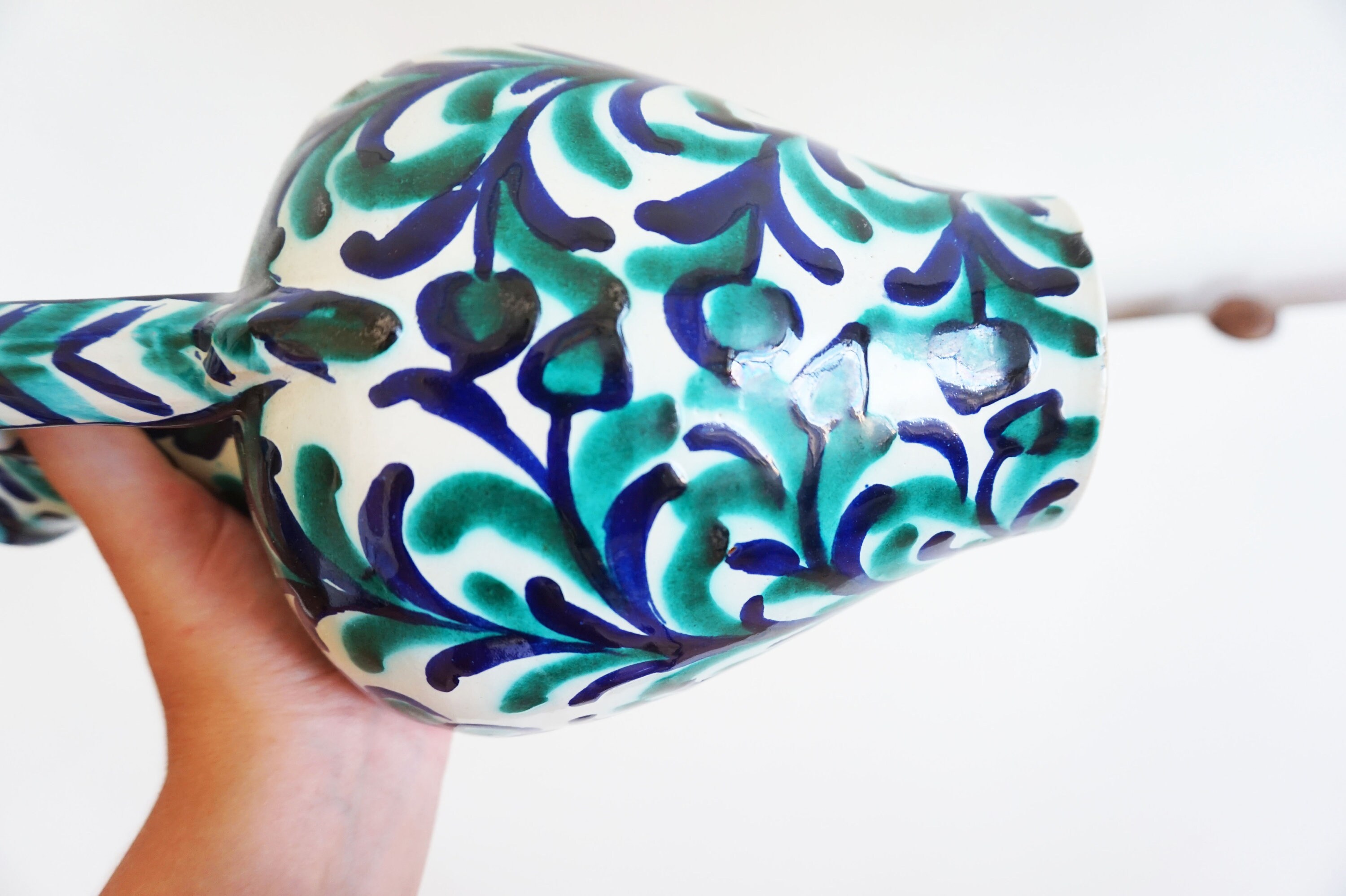 Nice pitcher ceramic vintage flower print pattern in shades of blue green and white.